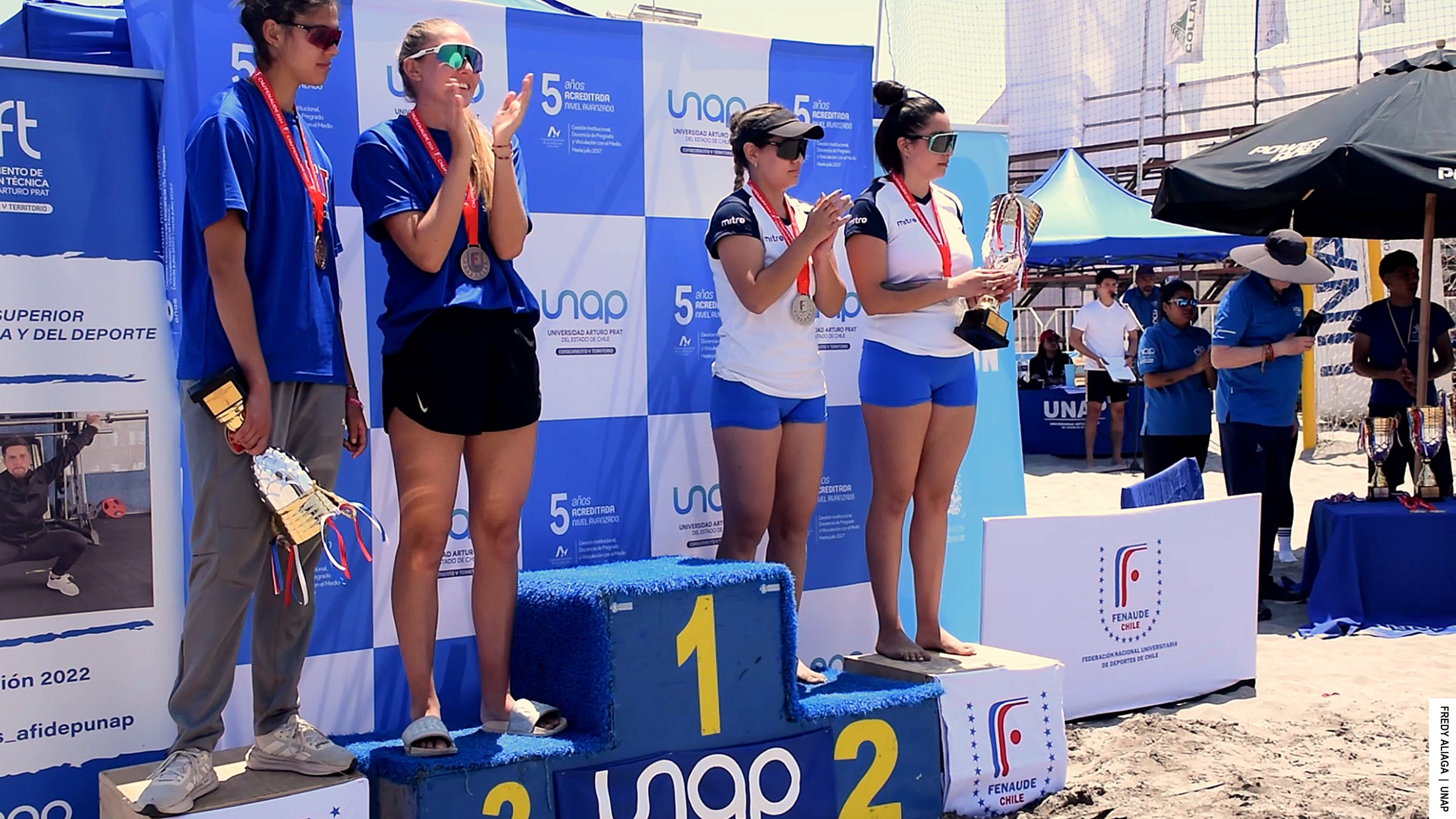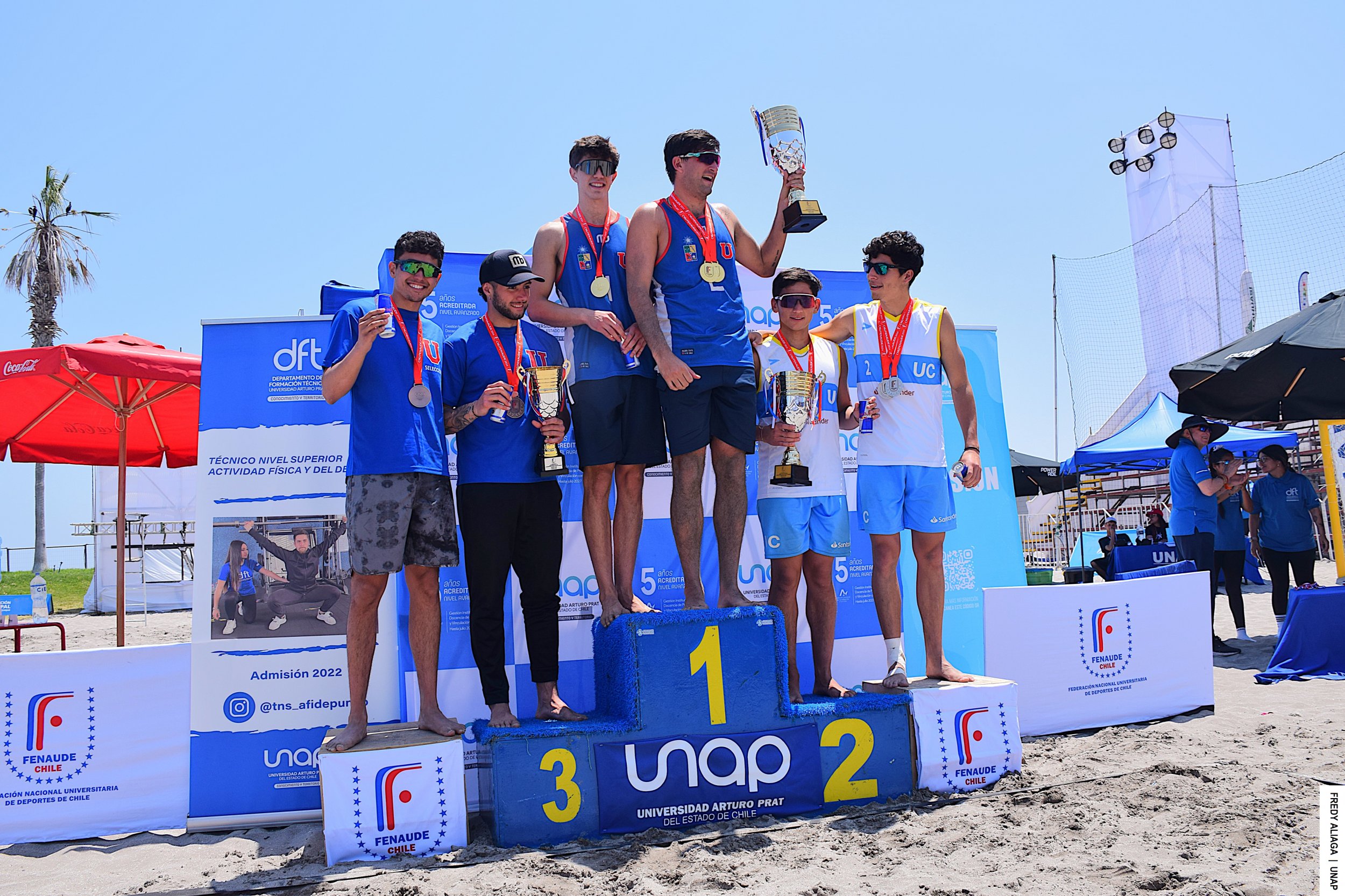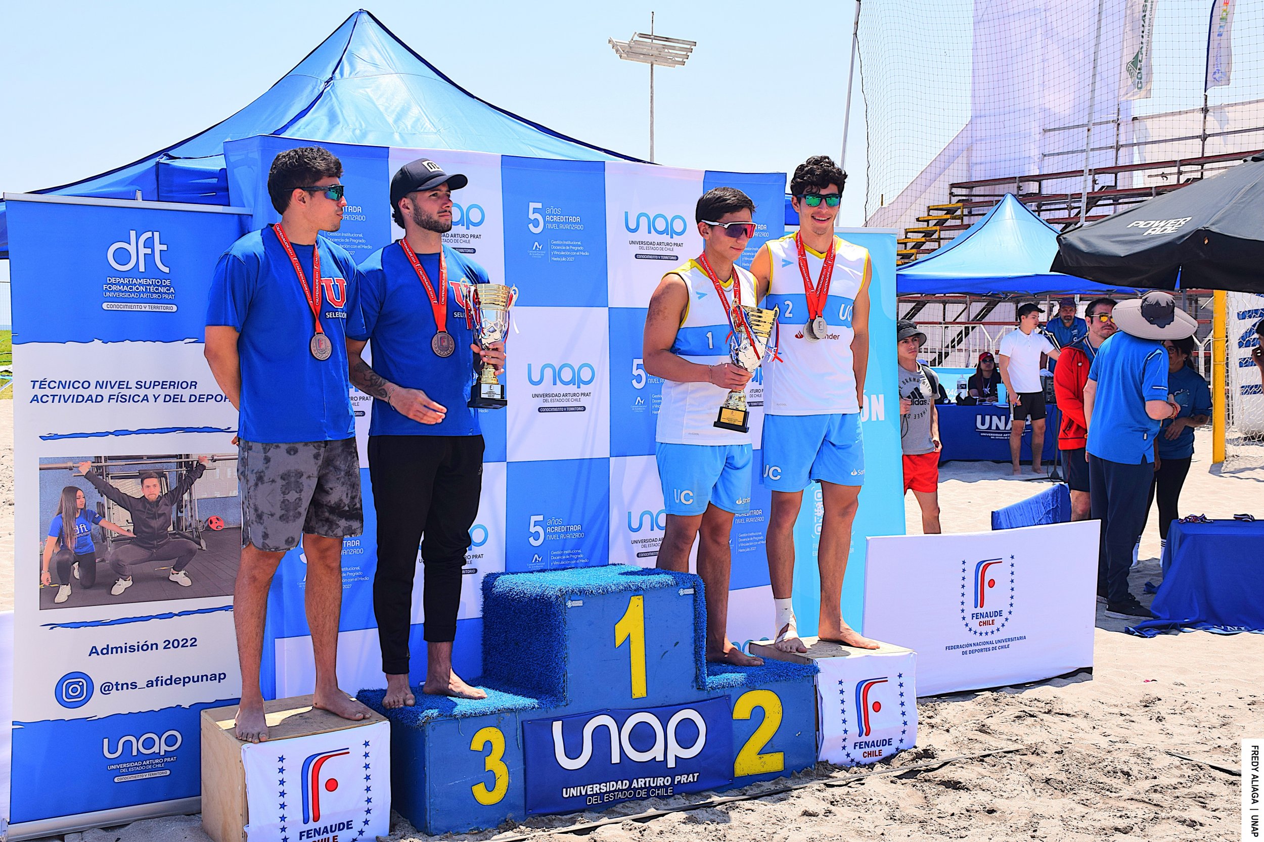 La U. de Chile, U. Arturo Prat y la U. Católica compartieron el podio con los tres mejores lugares del Campeonato Nacional Universitario de Voleibol Playa que reunió a 14 equipos del país. La final —de alto nivel deportivo— se disputó este viernes 4 de octubre en el recinto Arena Cavancha de Iquique, Región de Tarapacá. El evento fue organizado por UNAP y la Federación Nacional Universitaria de Deportes FENAUDE.