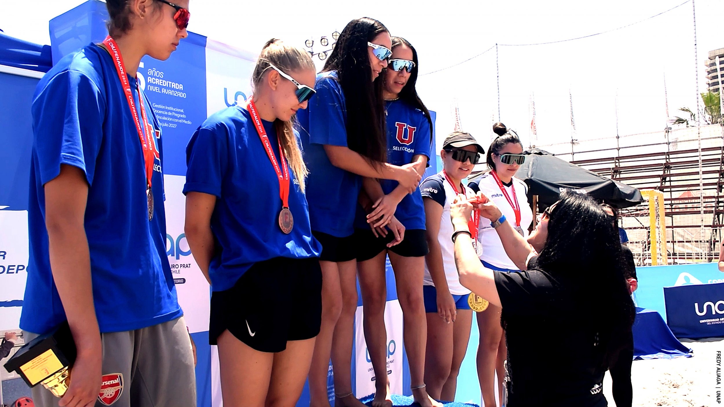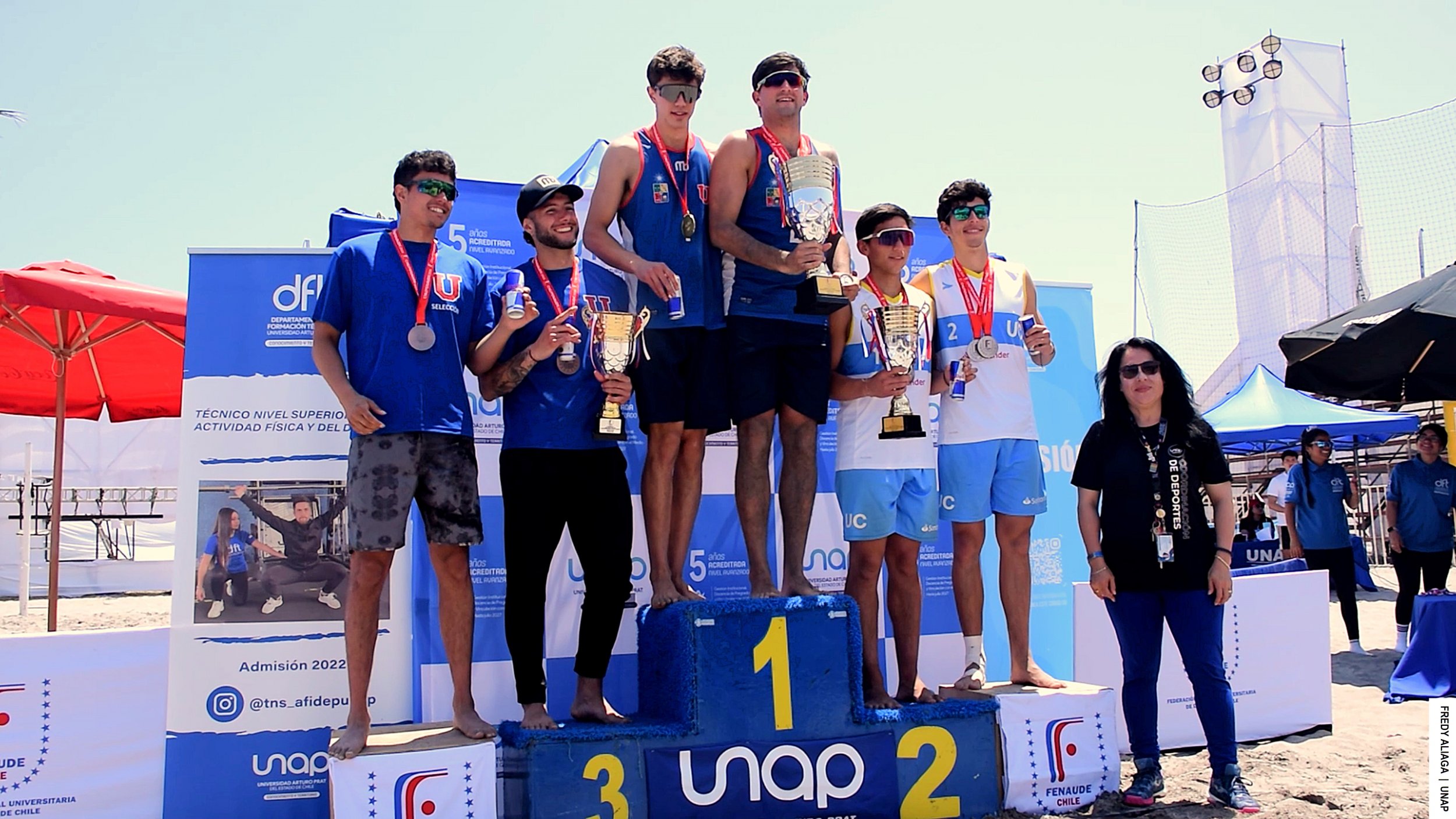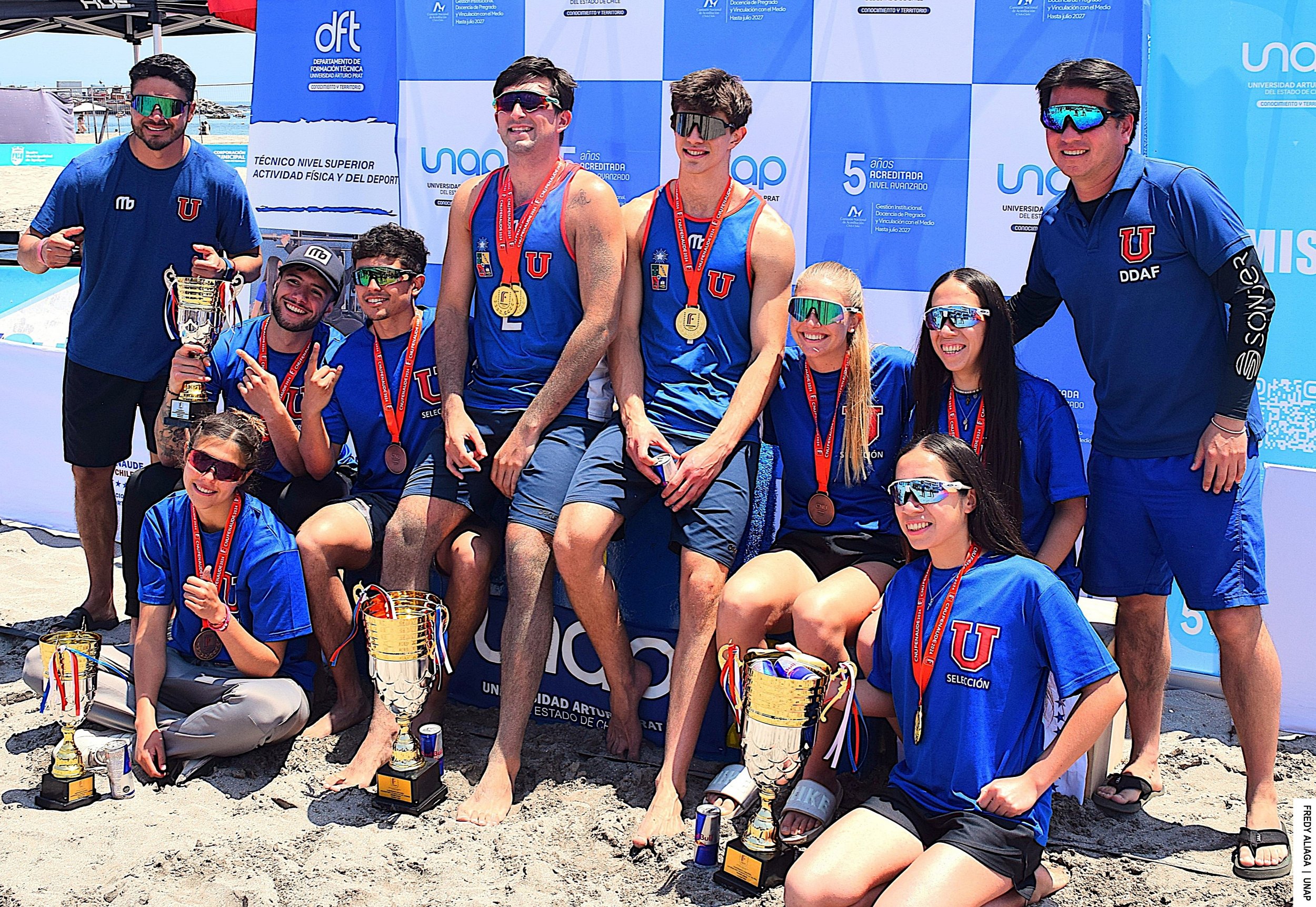 La U. de Chile, U. Arturo Prat y la U. Católica compartieron el podio con los tres mejores lugares del Campeonato Nacional Universitario de Voleibol Playa que reunió a 14 equipos del país. La final —de alto nivel deportivo— se disputó este viernes 4 de octubre en el recinto Arena Cavancha de Iquique, Región de Tarapacá. El evento fue organizado por UNAP y la Federación Nacional Universitaria de Deportes FENAUDE.