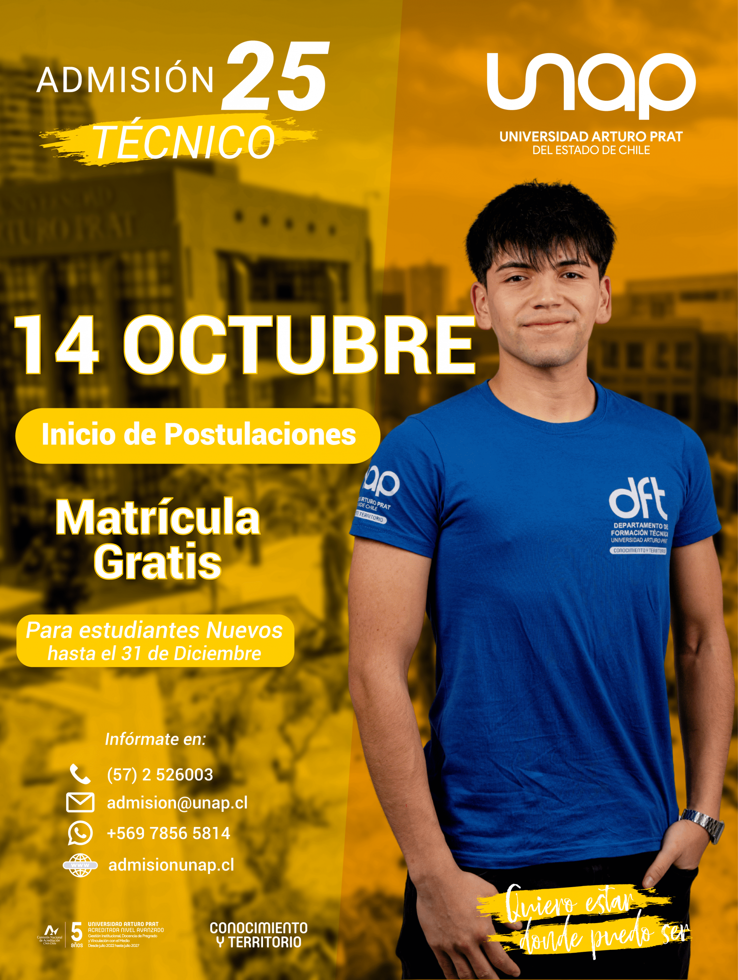 Habiendo iniciado el pasado 14 de octubre, el proceso de postulación a las carreras del Departamento de Formación Técnica (DFT) y de Continuidad de Estudios, en la Universidad Arturo Prat Sede Victoria, presenta un total de 510 cupos disponibles para todos aquellos interesados en potenciar su aprendizaje y aumentar sus posibilidades de éxito en el mundo laboral.