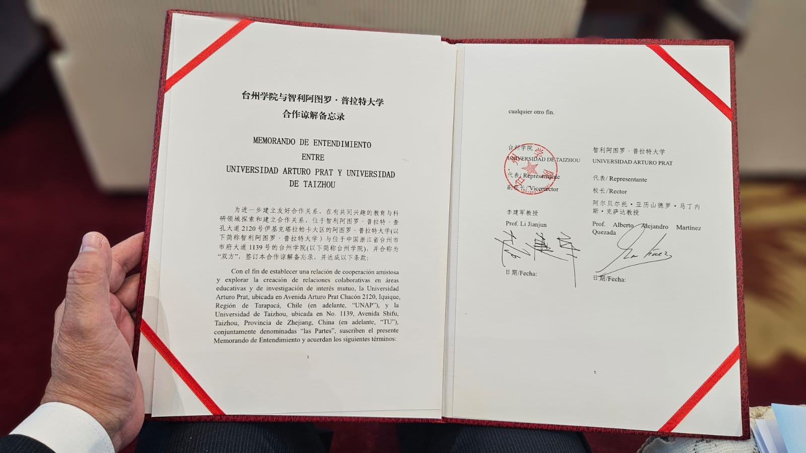 Además, enfatizó las potencialidades de intercambio estudiantil, docente, científico y de postgrado entre la UNAP y la Universidad de Taizhou, como parte del nuevo acuerdo suscrito. También, resaltó las posibilidades de cooperación comercial, industrial, cultural, turística, tecnológica, y el interés demostrado al respecto por autoridades de Taizhou y del Gobierno de China.