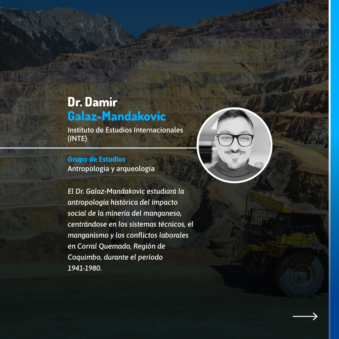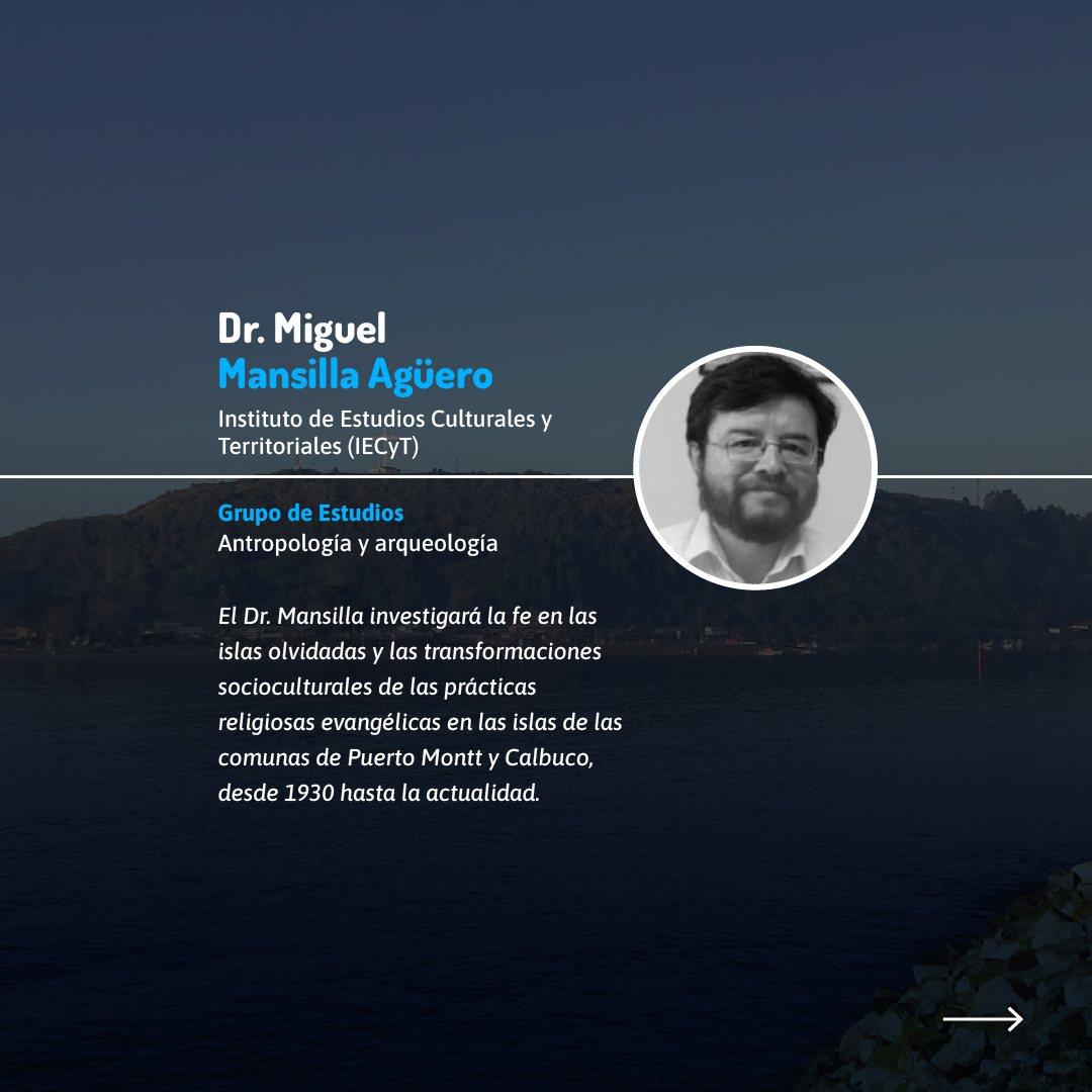 Por su parte, la Dra. Marcela Tapia Ladino, del Instituto de Estudios Internacionales (INTE), estudiará la securitización de las fronteras en la región de Tarapacá, y el Dr. Damir Galaz-Mandakovic, del mismo instituto, analizará el impacto social de la minería del manganeso en la región de Coquimbo. Además, el Dr. Miguel Ángel Mansilla Aguero, del grupo de Antropología y Arqueología, indagará sobre las transformaciones socioculturales en las prácticas religiosas evangélicas en las islas de las comunas de Puerto Montt y Calbuco, desde 1930 hasta la actualidad.