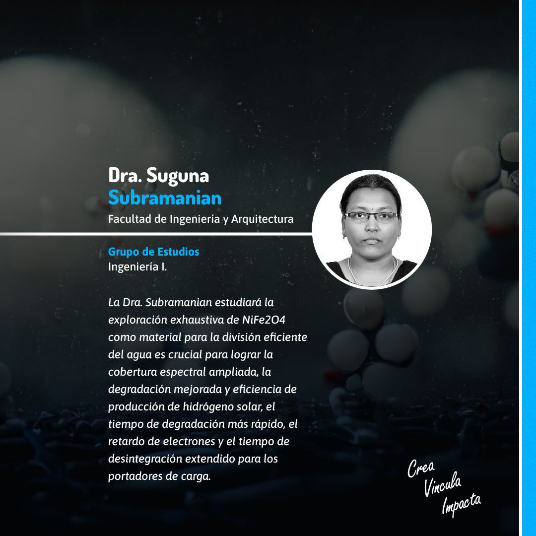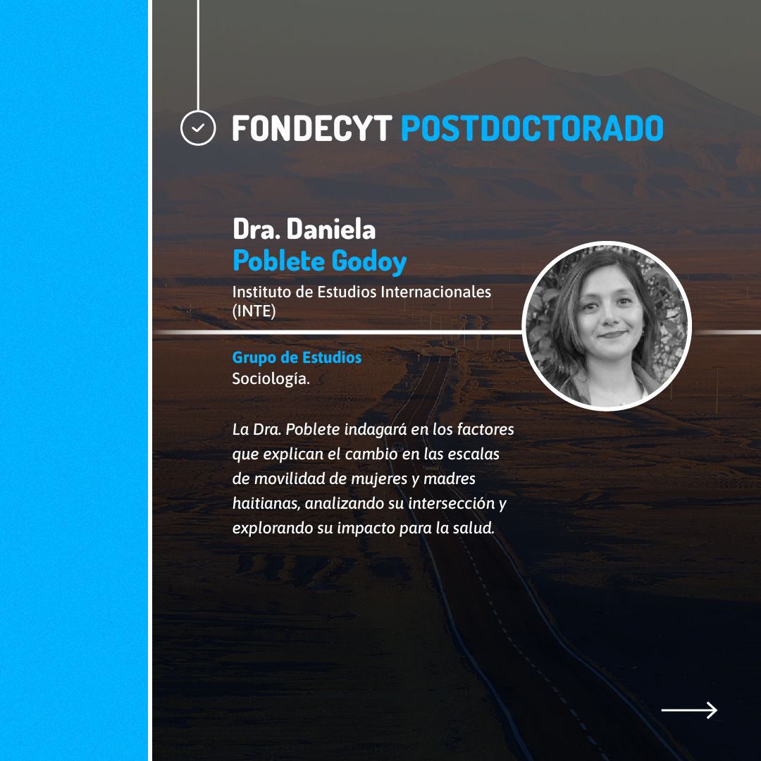 En el área de Postdoctorado, la Dra. Daniela Poblete Godoy, del INTE, indagará los factores que explican el cambio en las escalas de movilidad de mujeres haitianas, muentras que la Dra. Suguna Subramanian, de la Facultad de Ingeniería y Arquitectura, realizará un estudio sobre la eficiencia de materiales para la división del agua, enfocado en la producción de hidrógeno solar.