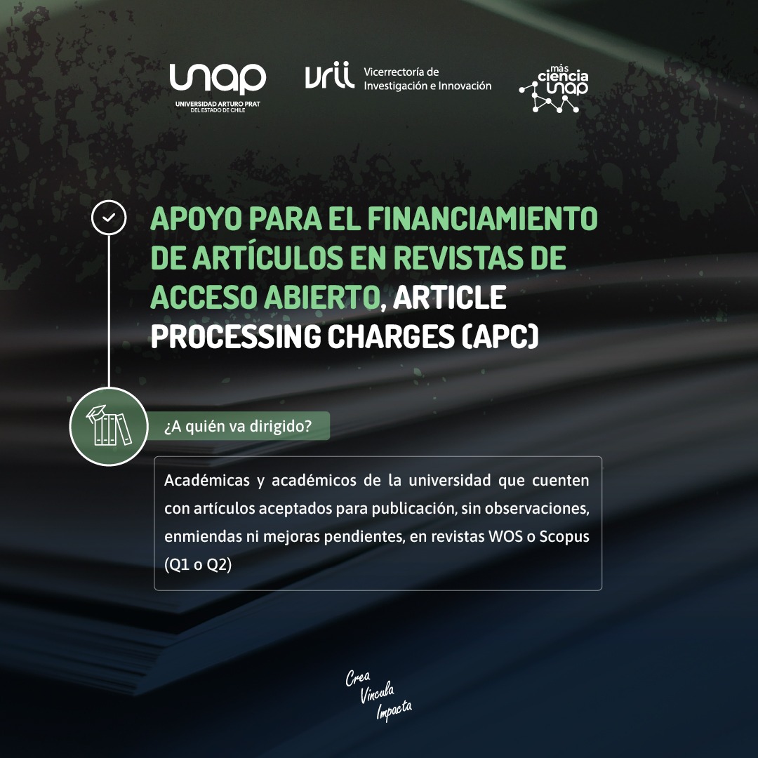 En el contexto de los proyectos del Ministerio de Educación ESR 2395 y UAP 23992, la Universidad Arturo Prat ha implementado el Programa de Apoyo a la Publicación de Artículos de Acceso Abierto (APC). Este programa tiene como objetivo principal financiar las tasas de publicación (Article Processing Charges, APC) en revistas científicas de alto impacto y acceso abierto (modalidades Gold y Green).