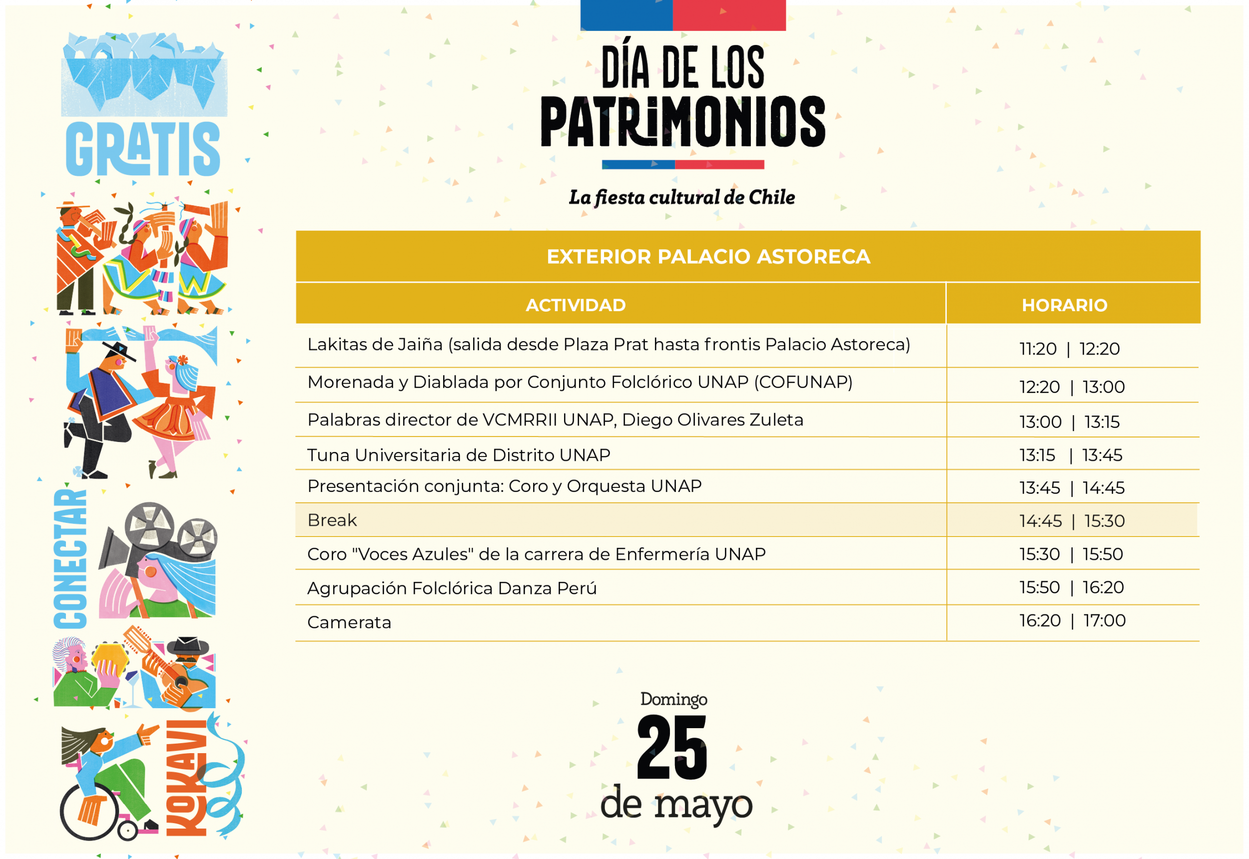 El programa, que podrán encontrar en el siguiente link https://www.unap.cl/diadelospatrimonios, incluye presentaciones del Coro y Orquesta institucional, el Conjunto Folclórico COFUNAP, la tradicional Tuna de Distrito y el Coro Voces Azules de la carrera de Enfermería. Además, estarán presentes agrupaciones invitadas como Camerata, Lakitas de Jaiña, Canto Latinoamericano, Danza Perú y la Banda Venus.