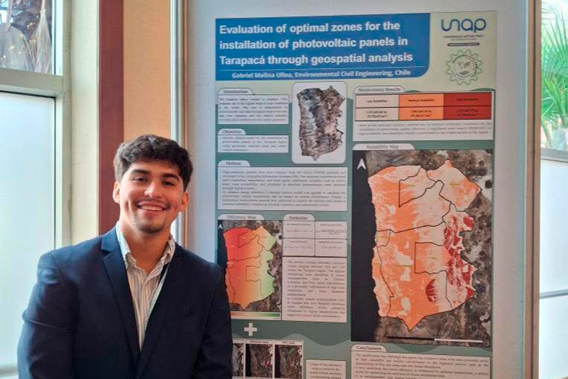Con su póster sobre la “Evaluación de zonas óptimas para ubicación de paneles fotovoltaicos en Tarapacá mediante análisis geoespacial”, el estudiante de la carrera de Ingeniería Civil Ambiental, Gabriel Molina Ulloa, se presentó como único representante de la Universidad Arturo Prat en el 9° Congreso Internacional de Medio Ambiente y Responsabilidad Social en Minería, Sustainable Mining 2025, organizado por GECAMIN.