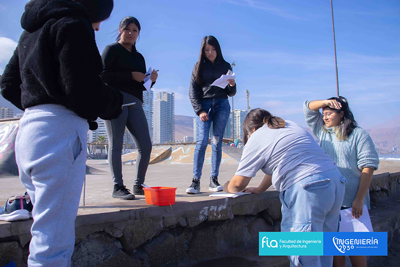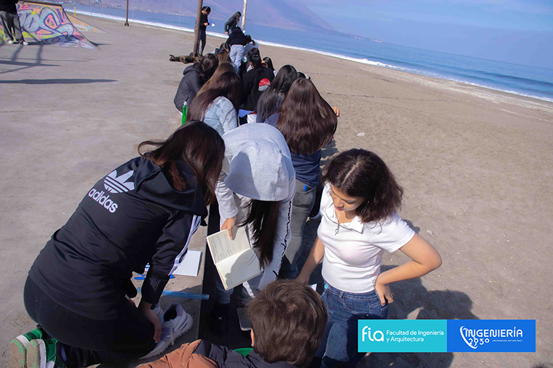 Durante el primer taller, las estudiantes se trasladaron a Playa Brava, donde realizaron una actividad práctica que consistió en rellenar contenedores con agua y medir el vaciado de los recipientes en distintos intervalos de tiempo. La académica de Ingeniería Civil Industrial y encargada del taller, Paola Mamani, explicó que, a través de esta experiencia, las estudiantes trabajaron en el análisis del vaciado de un estanque, aprendiendo a modelarlo a escala piloto y a medir diversos parámetros, como el tiempo de vaciado, la influencia del tamaño del orificio y la altura del fluido en la salida. Además, utilizaron recipientes con distintas geometrías, lo que también incide en los cálculos finales asociados al proceso de vaciado.