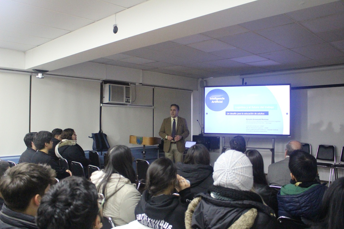 Gonzalo Grünewald, jefe de carrera de Ingeniería en Administración Logística, abordó la implementación de la Inteligencia Artificial en el mundo laboral, precisamente, en el ámbito de su conocimiento en logística, lo que fue recibido y valorado por los estudiantes de Ingeniería Comercial de la Universidad Tecnológica Metropolitana.