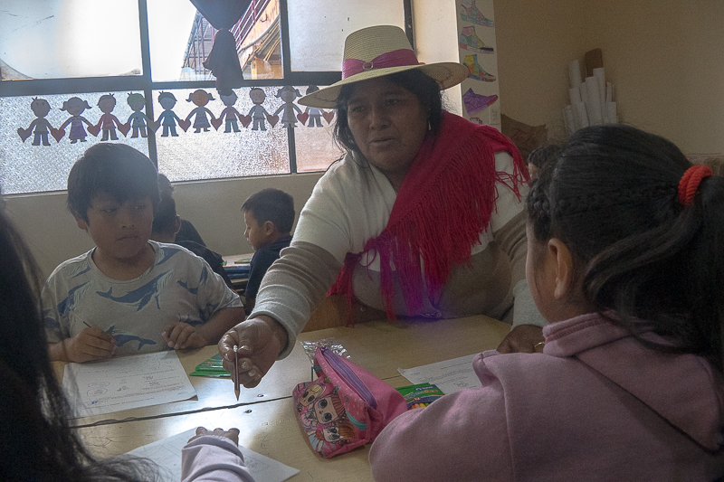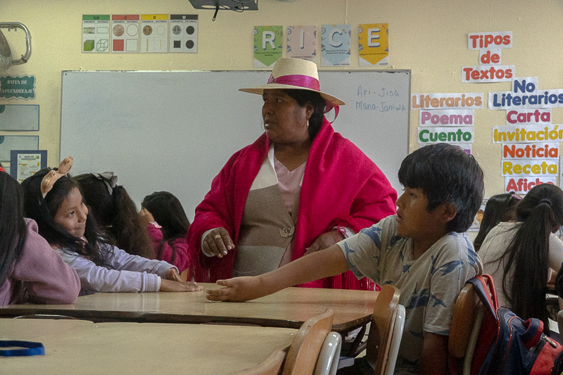 Proveniente de Pachica, Sonia Mamani, educadora tradicional, nos habla desde el alma. “Nuestra lengua se estaba perdiendo. Pero aquí rescatamos los saberes, las costumbres, la siembra de la quinoa, de las papas, los telares, los animales, todo eso que es parte de nuestro mundo y que tratamos de enseñar a nuestras niñas y niños”.