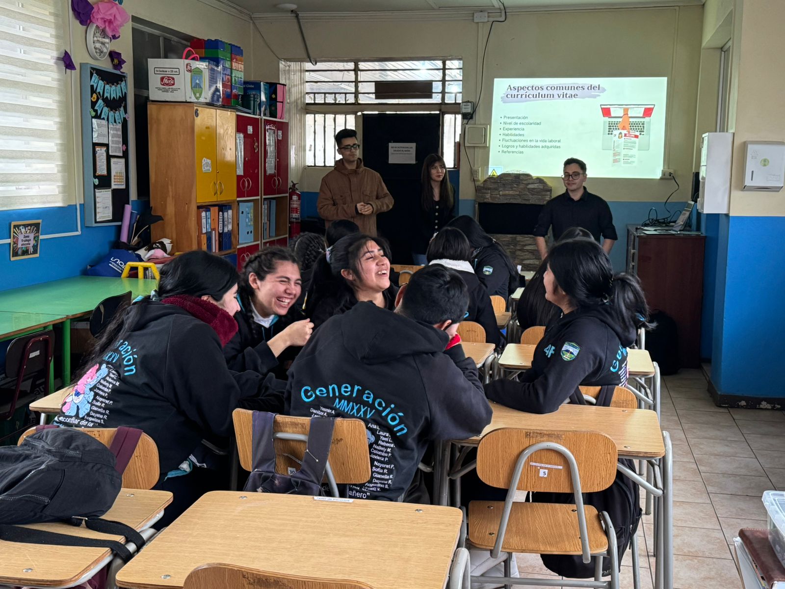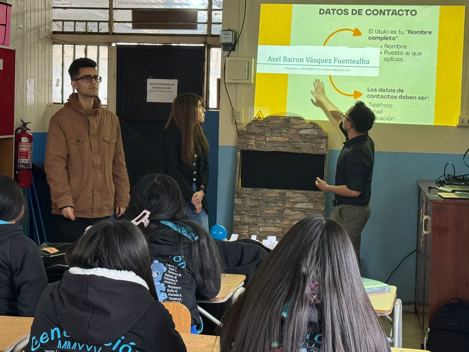 El segundo segmento, en cambio, se realizó durante la tarde en las dependencias del Liceo Politécnico, en donde los universitarios de quinto año de Psicología, Gabriel Venegas González, Scarlett Navarrete Jara y Axel Vásquez Fuentealba, visitaron el aula para desarrollar una extensa exposición sobre “Diseño de curriculum vitae y preparación para una entrevista laboral”, la que fue muy valorada por las personas que participaron.