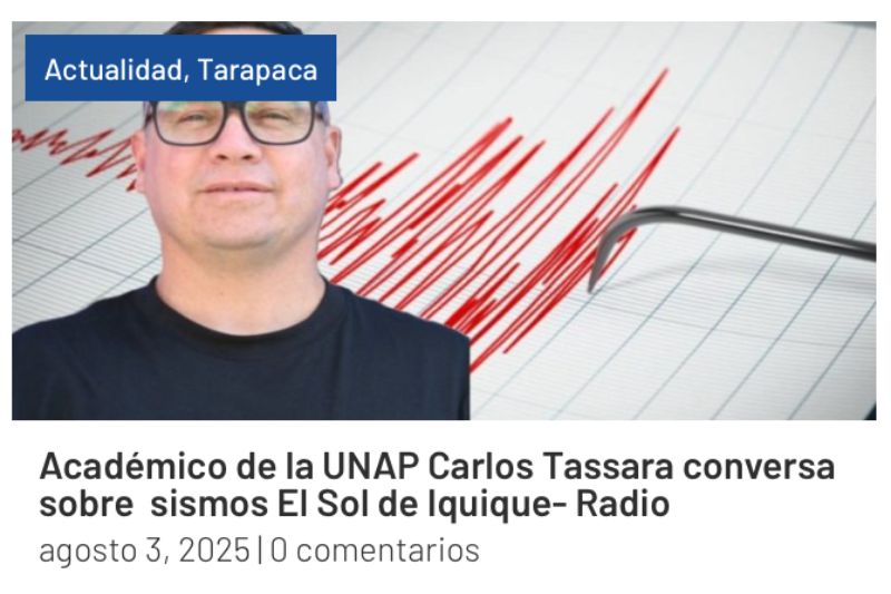 Durante la reciente emergencia de tsunami que afectó a la zona norte de Chile, el trabajo de orientación y monitoreo científico fue fundamental para enfrentar la incertidumbre de la población. En este contexto, Carlos Tassara Gutiérrez, Magíster en Geofísica, académico de la Facultad de Ciencias y encargado del Centro de Análisis Sismológico del Instituto de Ciencias Exactas y Naturales (ICEN) de la Universidad Arturo Prat, cumplió un rol destacado al liderar el seguimiento de la situación y ser el principal vocero local ante los medios. Estuvo en continua comunicación con los medios de comunicación, explicando el fenómeno ocurrido en Rusia —el terremoto en la península de Kamchatka— y sus implicancias para nuestro país. Su participación fue considerablemente requerida por la prensa local con presencia en diferentes medios de comunicación regionales como: Radio Municipal, “La Mañana por Paulina” de Radio Paulina, El Sol de Iquique, Iquique Televisión, La Mañana Hospiciana de Hospicio Televisión, RTC Televisión, EdiciónCero.cl , Programa “Hoy x Hoy” de Radio Paulina, entre otros. Tassara entregó explicaciones claras y oportunas sobre el origen del evento, su evolución y las medidas preventivas que debía considerar la comunidad.