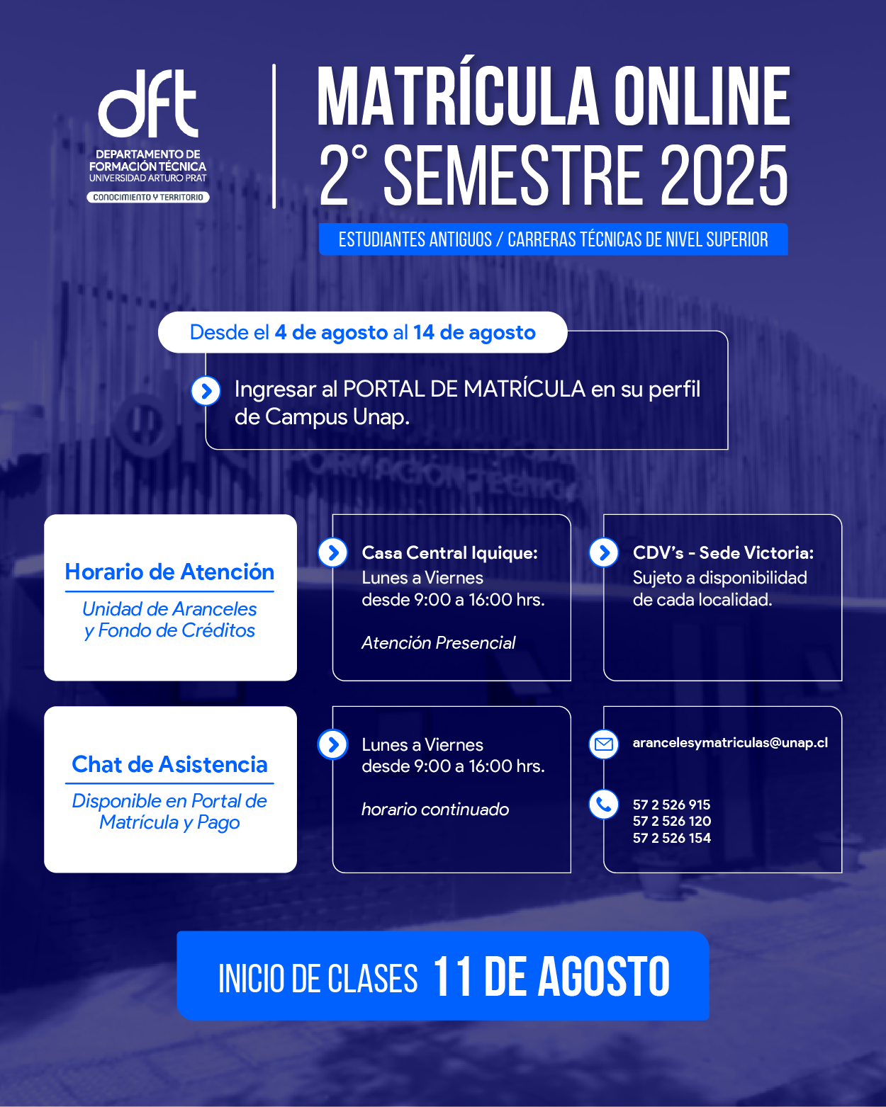 La Universidad Arturo Prat informa a la comunidad estudiantil del Departamento de Formación Técnica (DFT) que el proceso de matrícula para el segundo semestre 2025 estará disponible desde el 04 al 14 de agosto, a través del Portal UNAP.