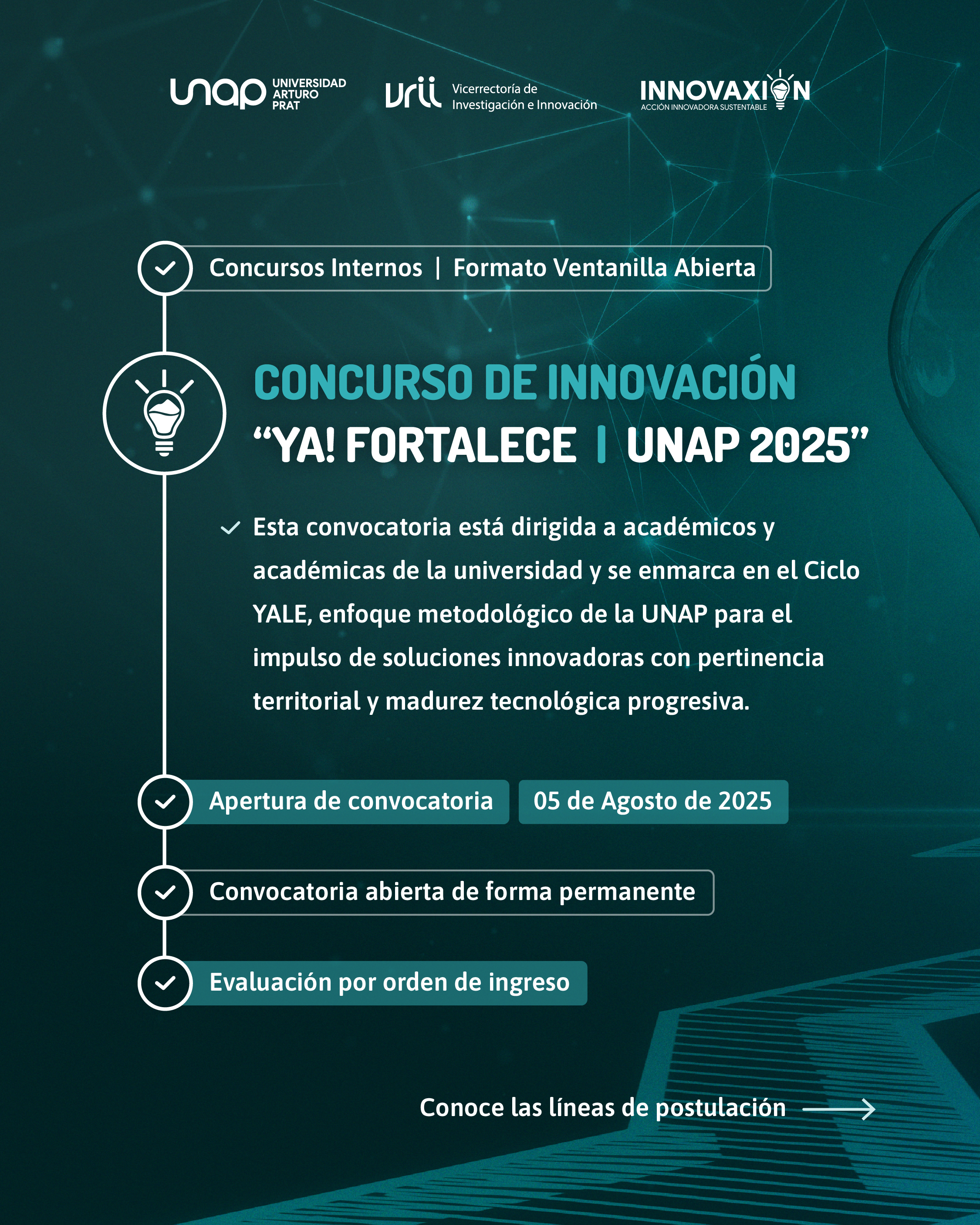 La Universidad Arturo Prat (UNAP), a través de su Vicerrectoría de Investigación e Innovación (VRII), anuncia el lanzamiento oficial del concurso interno “YA! Fortalece | UNAP 2025”, una iniciativa destinada a potenciar proyectos académicos con foco en la innovación, la pertinencia territorial y el desarrollo tecnológico progresivo.