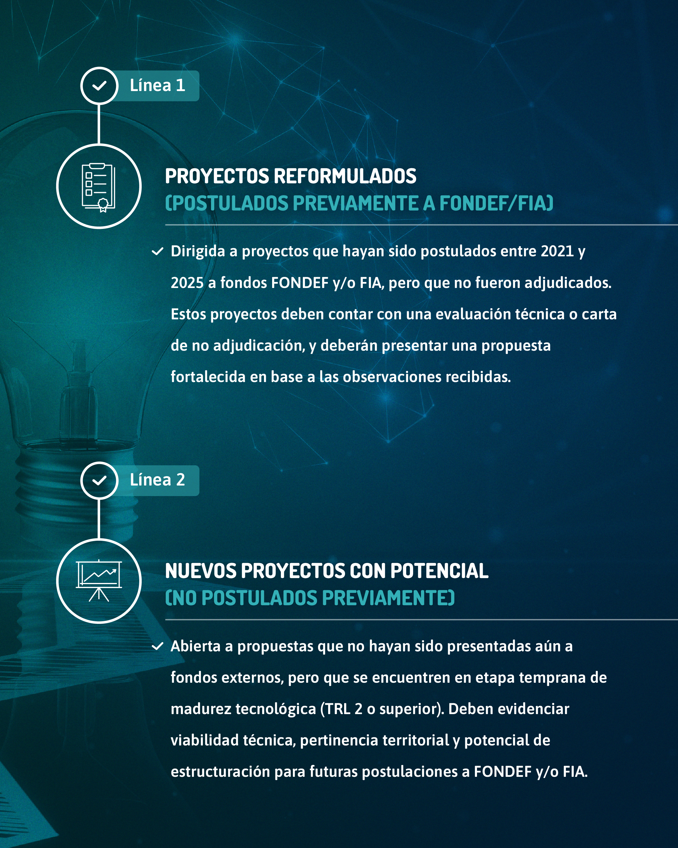 Línea 1 – Proyectos Reformulados: Para iniciativas que fueron postuladas entre 2021 y 2025 a fondos como FONDEF y/o FIA, pero que no resultaron adjudicadas. Estas propuestas deben contar con una carta de no adjudicación y presentar una versión fortalecida basada en las observaciones técnicas recibidas.