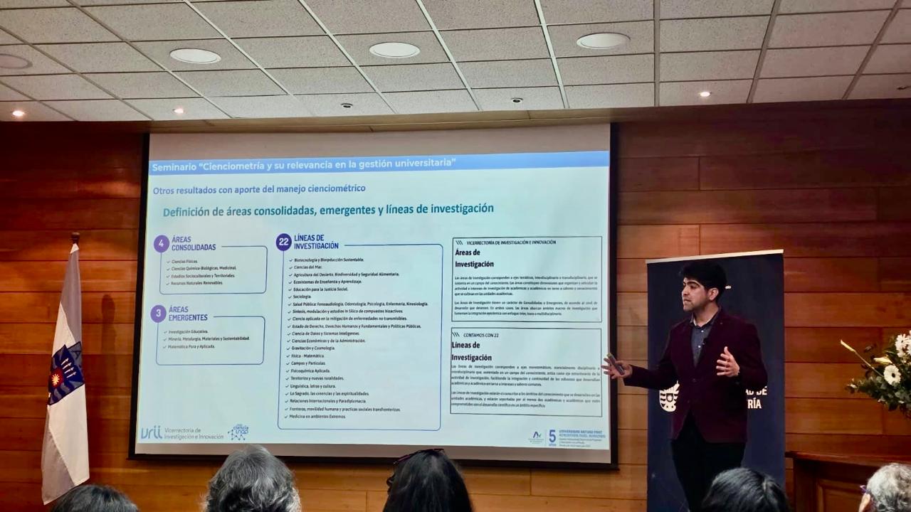 El seminario abordó temáticas como la corrección y retracción de publicaciones científicas, los desafíos actuales de la cienciometría, y el uso de indicadores para el análisis institucional. La Universidad Arturo Prat estuvo representada por el Mg. Eduardo Poblete Balaic, encargado de la Unidad de Gestión de la Información de la Vicerrectoría de Investigación e Innovación (VRII), quien destacó con la presentación de la ponencia titulada “Cienciometría en la Universidad Arturo Prat: Experiencias y desafíos”.