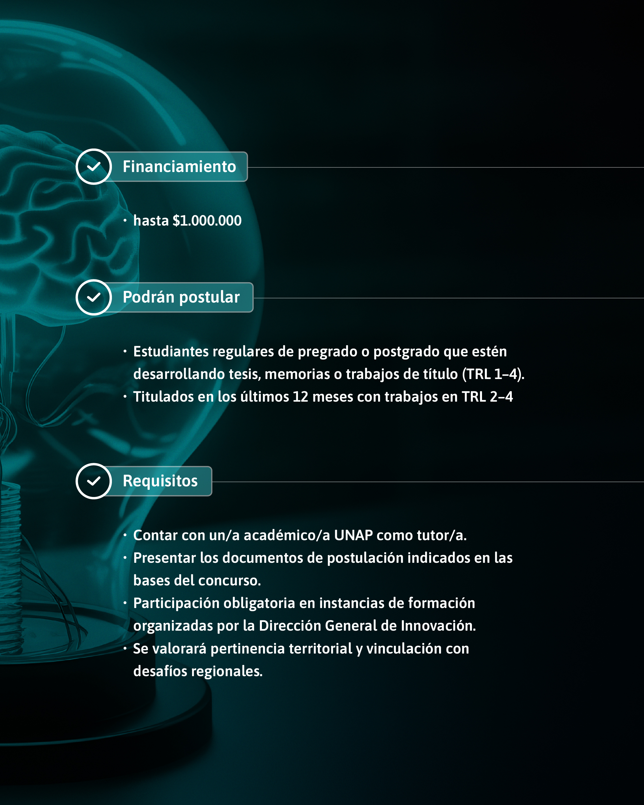 La convocatoria busca fortalecer proyectos liderados por estudiantes y titulados/as recientes de la UNAP, entregando financiamiento y acompañamiento técnico para avanzar en soluciones innovadoras con pertinencia territorial y proyección hacia fondos externos.