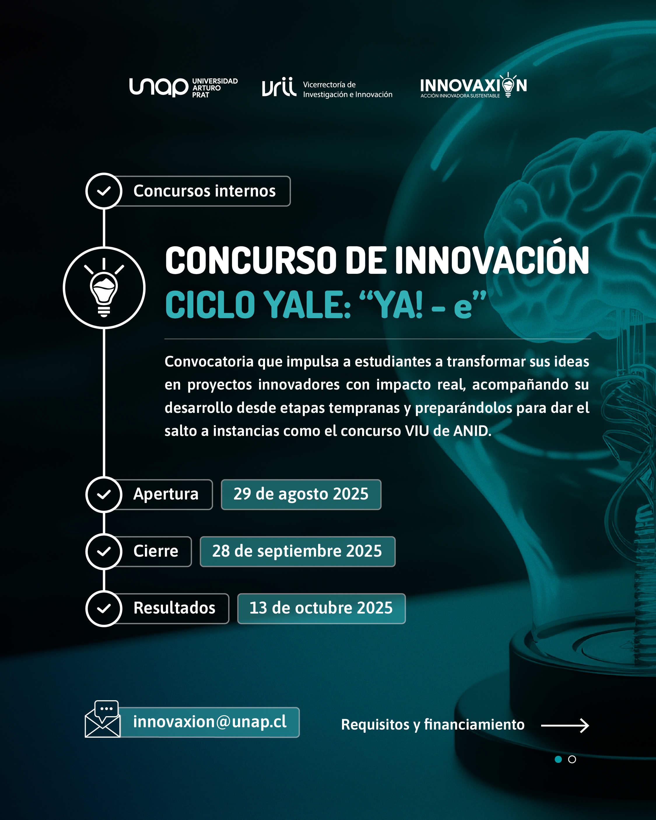 Las bases completas y el formulario de postulación están disponibles en el sitio de la Vicerrectoría de Investigación e Innovación de la UNAP, y las consultas deben dirigirse al correo innovaxion@unap.cl