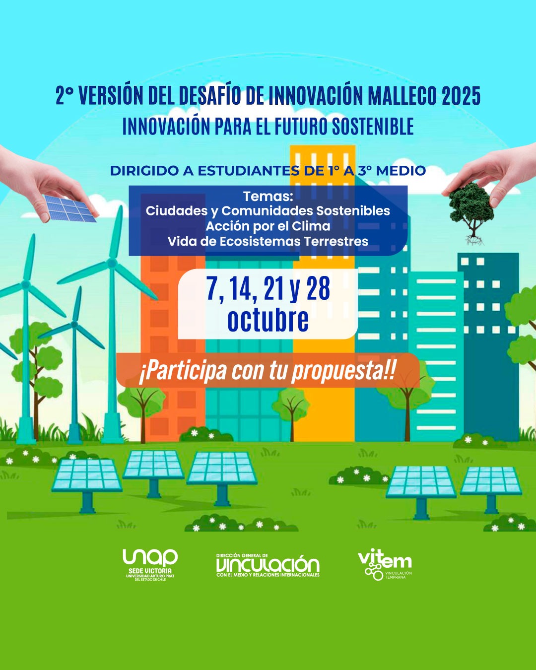Buscando fomentar la cultura de innovación y el emprendimiento entre los jóvenes de la provincia, la Unidad de Investigación e Innovación, el Programa de Vinculación Temprana (VITEM) y la Unidad de Vinculación con el Medio de la Universidad Arturo Prat Sede Victoria, se enorgullecen en anunciar la segunda versión del “Desafío de Innovación Malleco 2025: Innovación para un futuro sostenible”.