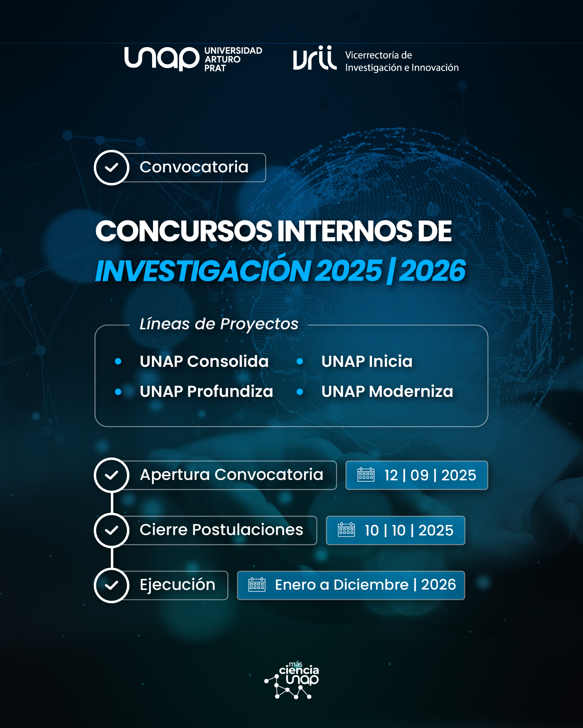 Con esta convocatoria, la Universidad Arturo Prat reafirma su compromiso con el fomento de la investigación, la innovación y la generación de conocimiento desde y para los territorios. Se invita a toda la comunidad académica a informarse y postular a través de los canales oficiales, con el objetivo de seguir fortaleciendo una investigación de excelencia al servicio del desarrollo regional y nacional.