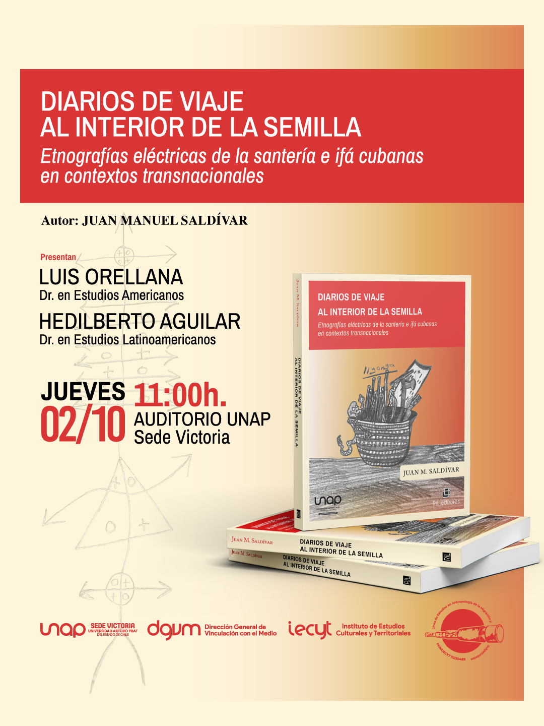 Con el propósito de seguir impulsando las investigaciones en todos los ámbitos del quehacer humano, la Universidad Arturo Prat Sede Victoria se enorgullece en invitar a todas y todos los interesados al lanzamiento de la más reciente publicación del Dr. Juan Manuel Saldívar Arellano, “Diarios de viaje al interior de la semilla. Etnografías eléctricas de la santería e ifá cubanas en contextos transnacionales”.