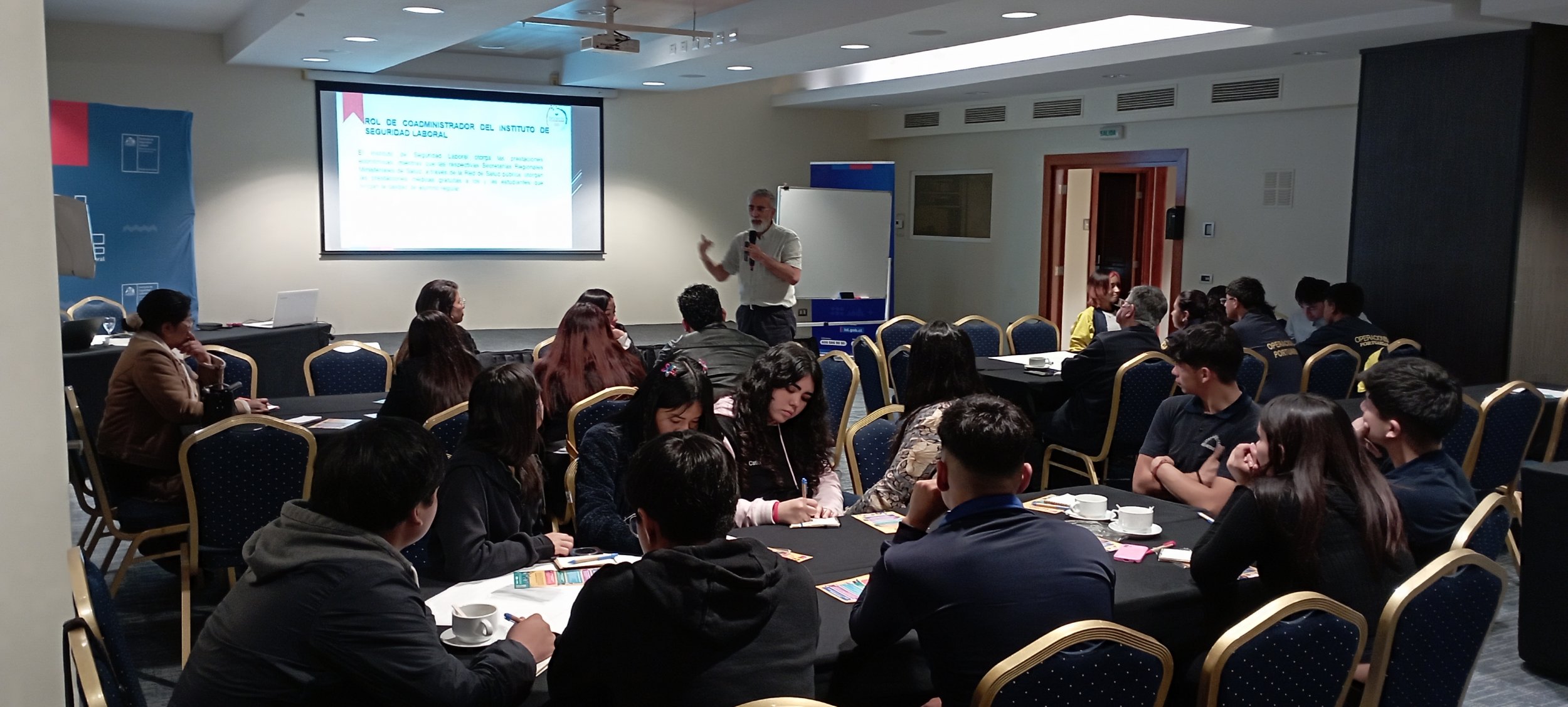Estudiantes de la carrera de Ingeniería en Prevención de Riesgos junto al director de carrera, Belfor Vilca Astorga, participaron en el Seminario “Beneficios Transformadores de la Protección Social, el Seguro Social de la Ley 16.744 y el Seguro Escolar”, del Instituto de Seguridad Laboral (ISL). La actividad contó con las ponencias del director del ISL Región de Tarapacá, Sergio Martínez Gutiérrez, y el jefe de prevención de riesgos, José Rivera Rodríguez, quienes compartieron conocimientos y experiencias.