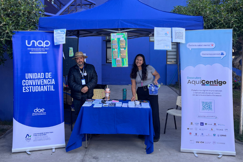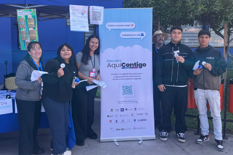Las actividades de difusión se realizan mediante stands informativos, material gráfico y promocional como pelotas antiestrés, chapitas y trípticos. Estas acciones se enmarcan en el cierre del proyecto de la Red de Universidades del CUECH, que permitió financiar la promoción de “Aquí Contigo”, una plataforma digital de salud mental.