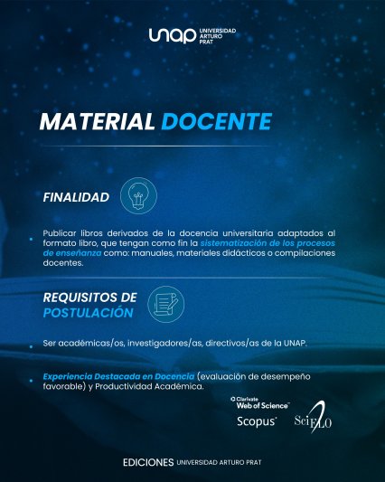 La convocatoria “Material Docente” invita a presentar textos creados en el contexto de la enseñanza universitaria, como manuales pedagógicos, compilaciones de materiales, libros de ejercicios y obras destinadas a sistematizar procesos de enseñanza en la educación superior.