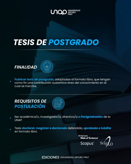 Por último, la convocatoria “Tesis de Postgrado” está orientada a tesis de magíster o doctorado aprobadas e inéditas, que puedan transformarse en libros de impacto disciplinar. El objetivo es promover la difusión de investigaciones avanzadas realizadas por académicos o investigadores postgraduados de la UNAP.