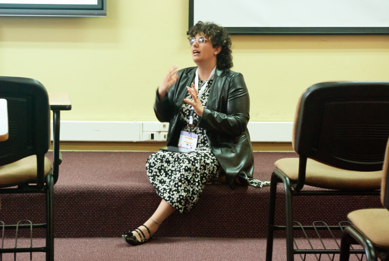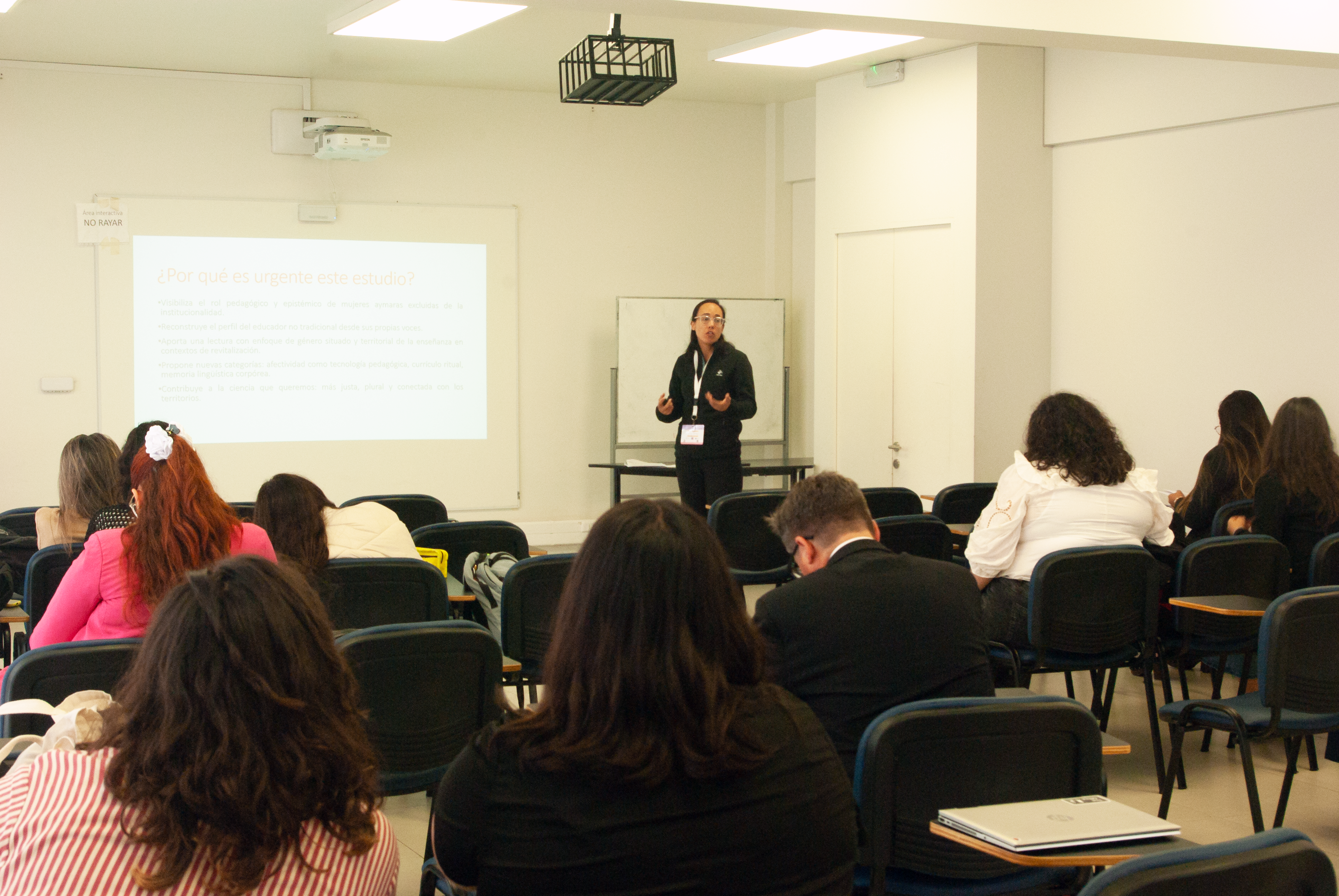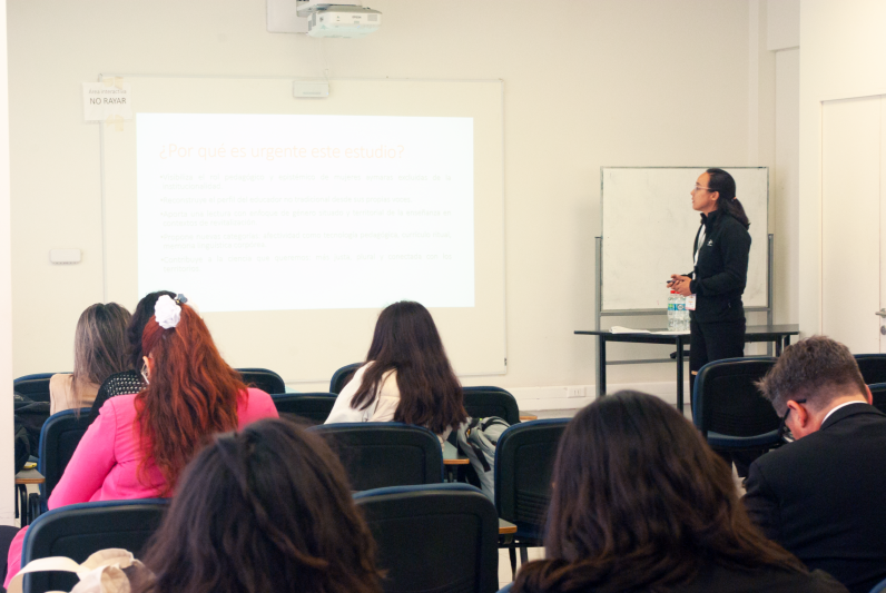 Hazel Barahona Gamboa, académica de Pedagogía en Lengua Castellana y Comunicación, presentó la ponencia titulada “Cuando la ciencia escucha a las sabias: educadoras no institucionales en nidos lingüísticos aymaras”, destacando la importancia de reconocer procesos educativos comunitarios y de revitalización lingüística.