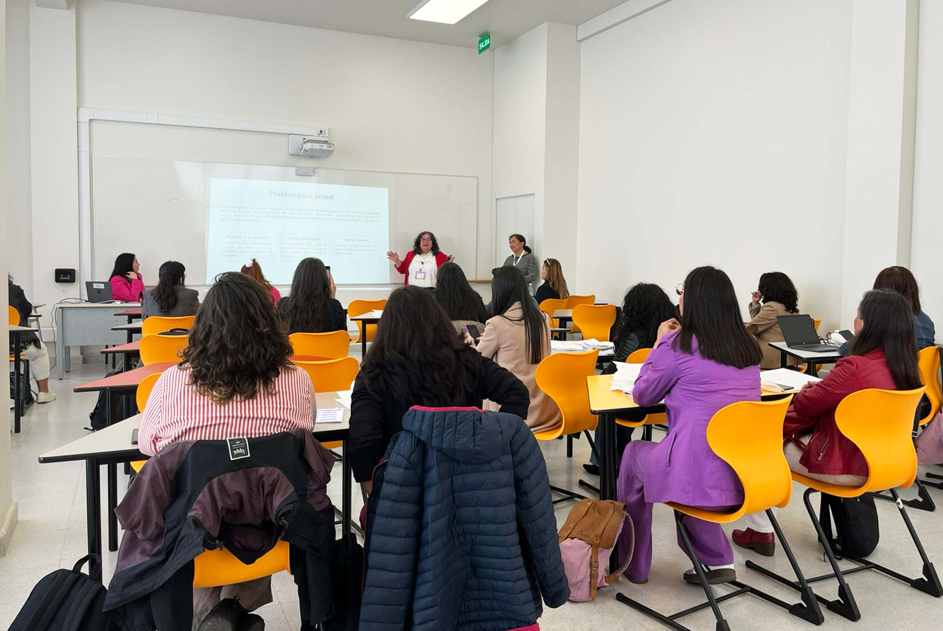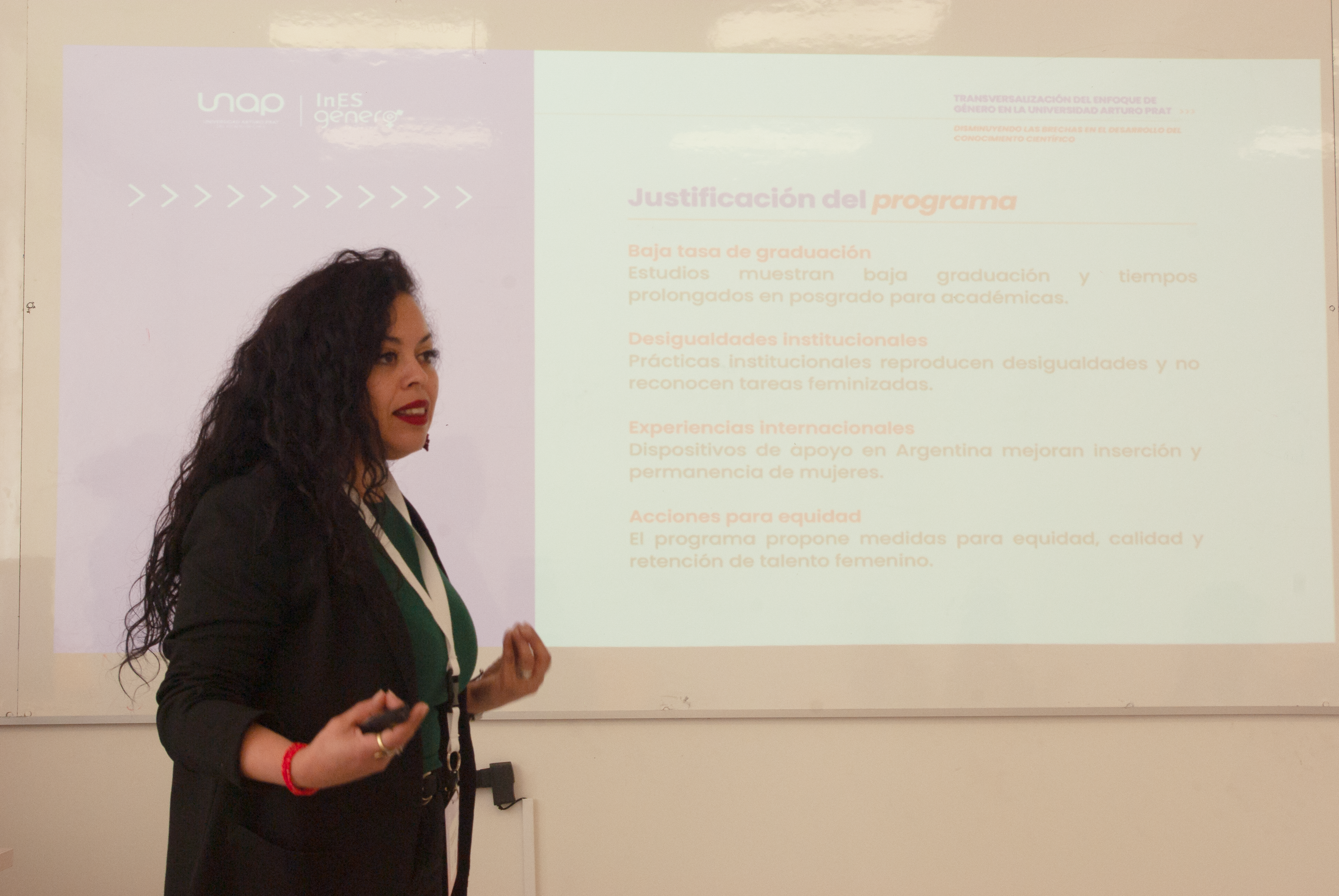 El segundo día, las sociólogas Mg. María Eugenia Soto y Daniela Rojas Vigueras, presentaron la ponencia titulada “Programa de Incorporación, Acompañamiento y Terminalidad al Posgrado para Académicas de la UNAP, donde Almendra Maribel Aladro es Co-autora.