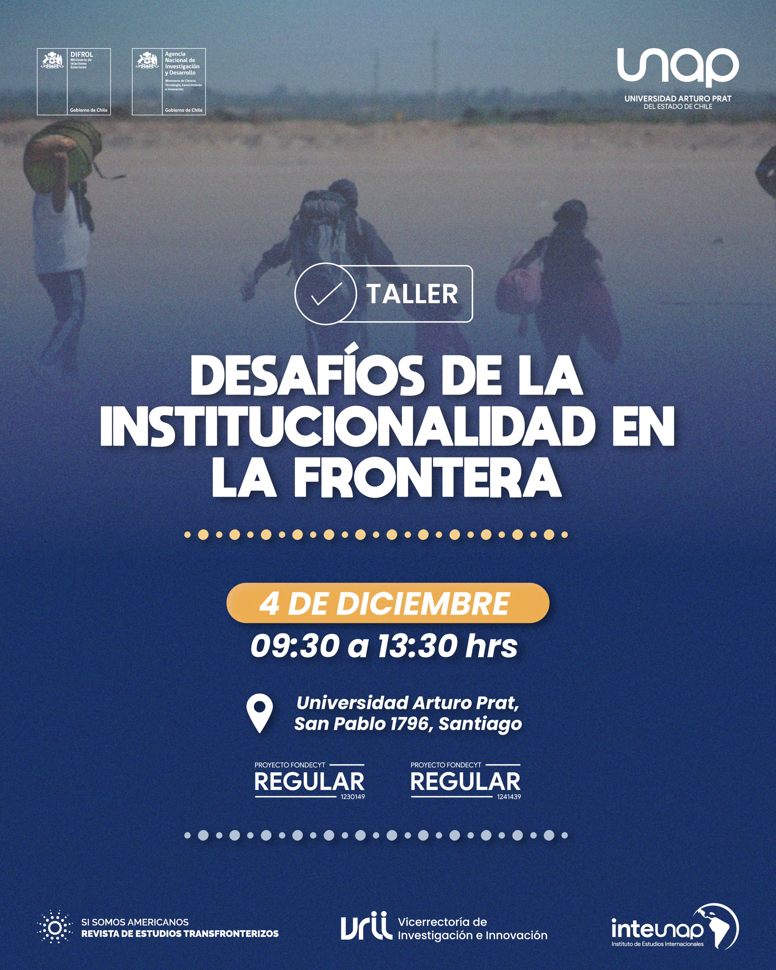 El 4 de diciembre se realizará en el Centro Docente y de Vinculación Santiago (CDV) eltaller “Desafíos de la institucionalidad en la frontera”, un espacio de análisis y reflexión sobre los retos que enfrentan los comites de integración fronteriza en nuestro país. La actividad es auspiciada por la Revista Si Somos Americanos, con el apoyo de los proyectos Fondecyt Regular 1230149 y 1241419, contará con presentaciones de académicos de la UNAP, de otras universidades y de la Dirección Nacional de Fronteras y Límites del Estado del Ministerio de Relaciones Exteriores (DIFROL), quienes abordarán, integración y proyecciones de las políticas de frontera en Chile. Se trata de una instancia orientada al diálogo experto y a la construcción de propuestas para fortalecer la institucionalidad en estas zonas estratégicas del país.