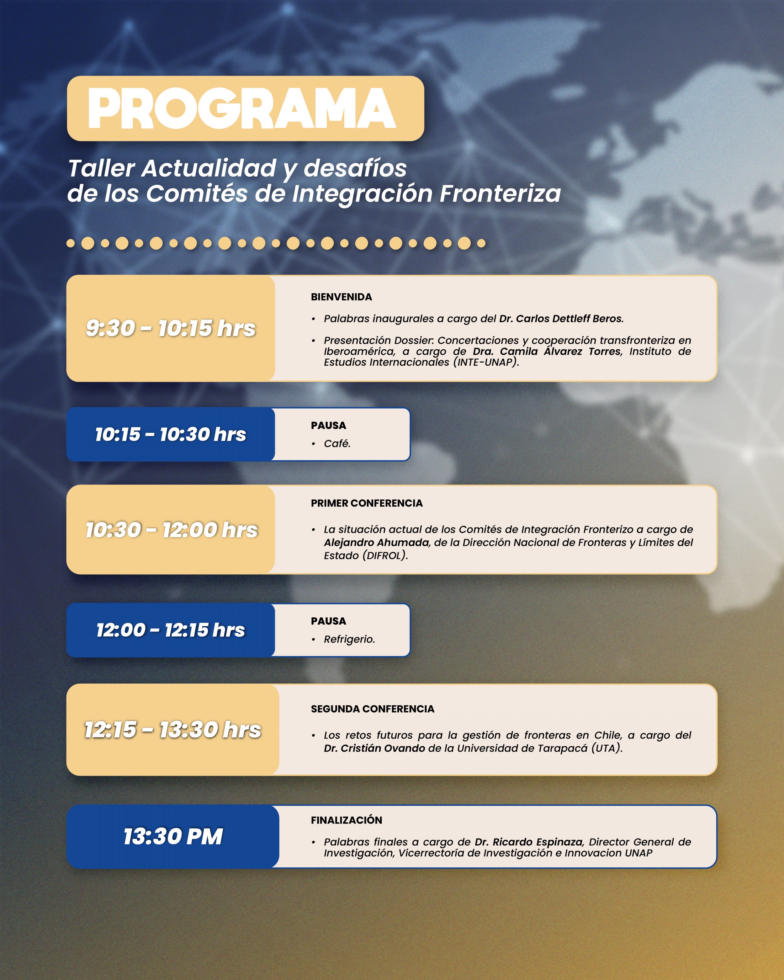 La jornada comenzará con las palabras inaugurales a cargo del Dr. Carlos Dettleff Beros, para luego continuar con la presentación del dossier “Concertaciones y cooperación transfronteriza en Iberoamérica” a cargo de la Dra. Camila Álvarez Torres, investigadora del Instituto de Estudios Internacionales de la UNAP, y la Dra. Inês Gusman, académica del Instituto de Estudos e Desenvolvimento de Galicia de la Universidad de Santiago de Compostela, España. Ambas especialistas lideran esta propuesta editorial orientada a reunir investigaciones que analicen las dinámicas de cooperación, gobernanza y concertación transfronteriza en el contexto iberoamericano.