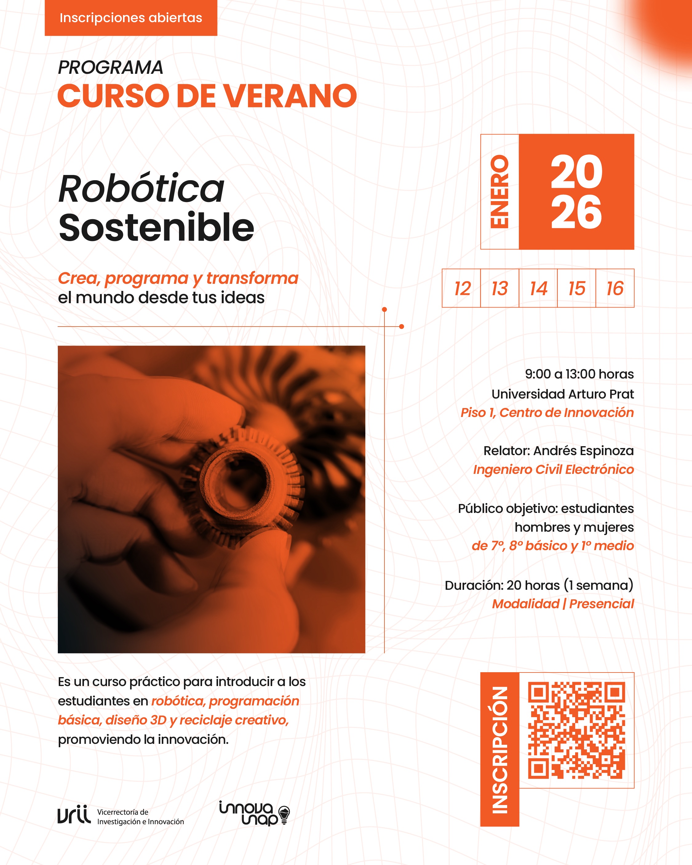 La Universidad Arturo Para a través de la Dirección General de Innovación INNOVA UNAP anunció la apertura de inscripciones para el “Curso de Verano 2026 - Robótica Sostenible: Crea, programa y transforma el mundo desde tus ideas”. Iniciativa formativa que busca acercar la ciencia, la tecnología y la innovación a estudiantes de la región de Tarapacá.