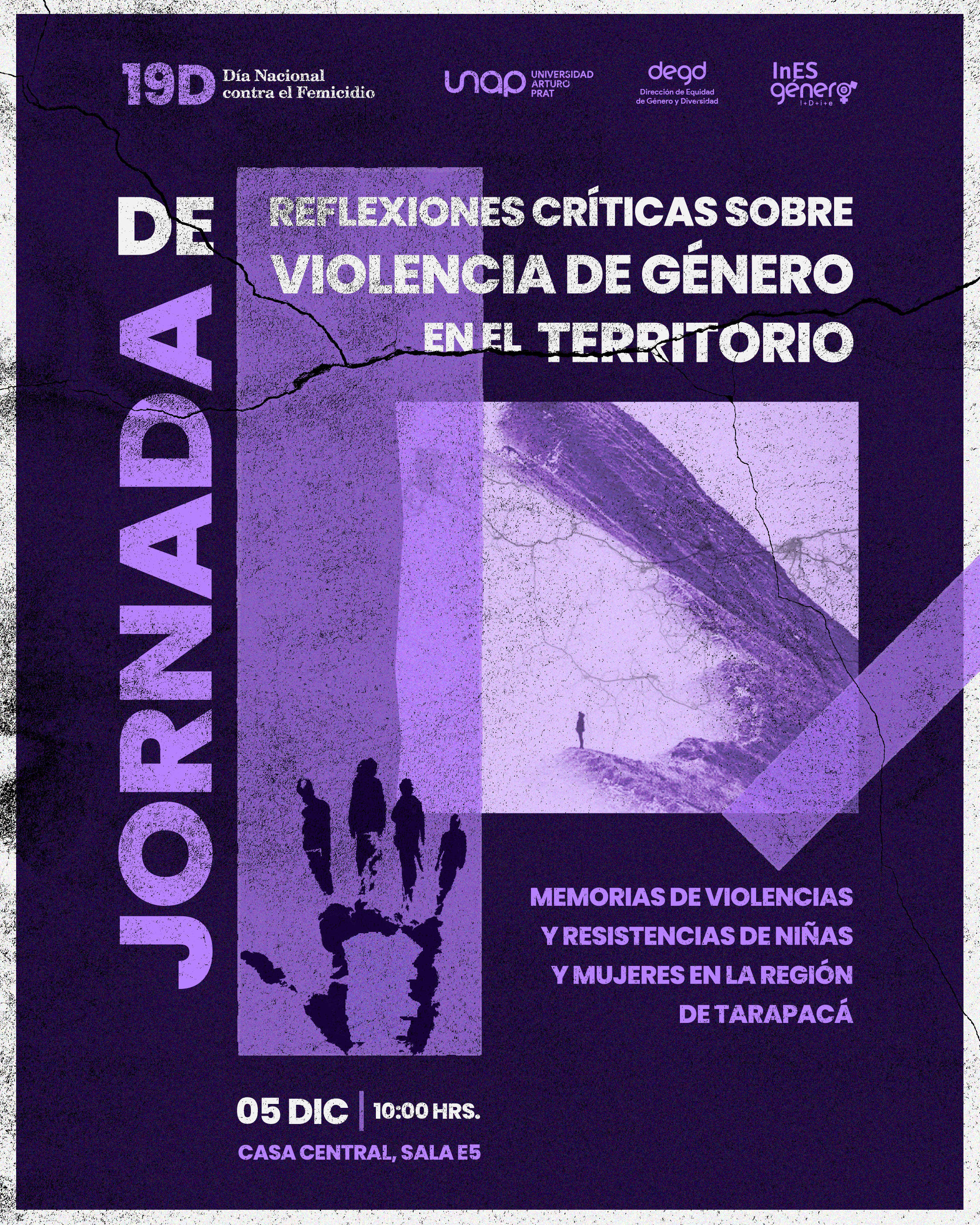 Este viernes 5 de diciembre de 2025, entre las 10:00 y las 12:30 horas, se llevará a cabo en la Sala E5 de Casa Central de la Universidad Arturo Prat (UNAP), la Jornada de Reflexiones Críticas sobre Violencia de Género en el Territorio: Memorias de Violencias y Resistencias de niñas y mujeres en la región de Tarapacá. La actividad se realizará en el marco de la conmemoración del Día Nacional contra el Femicidio en Chile, establecido cada 19 de diciembre.