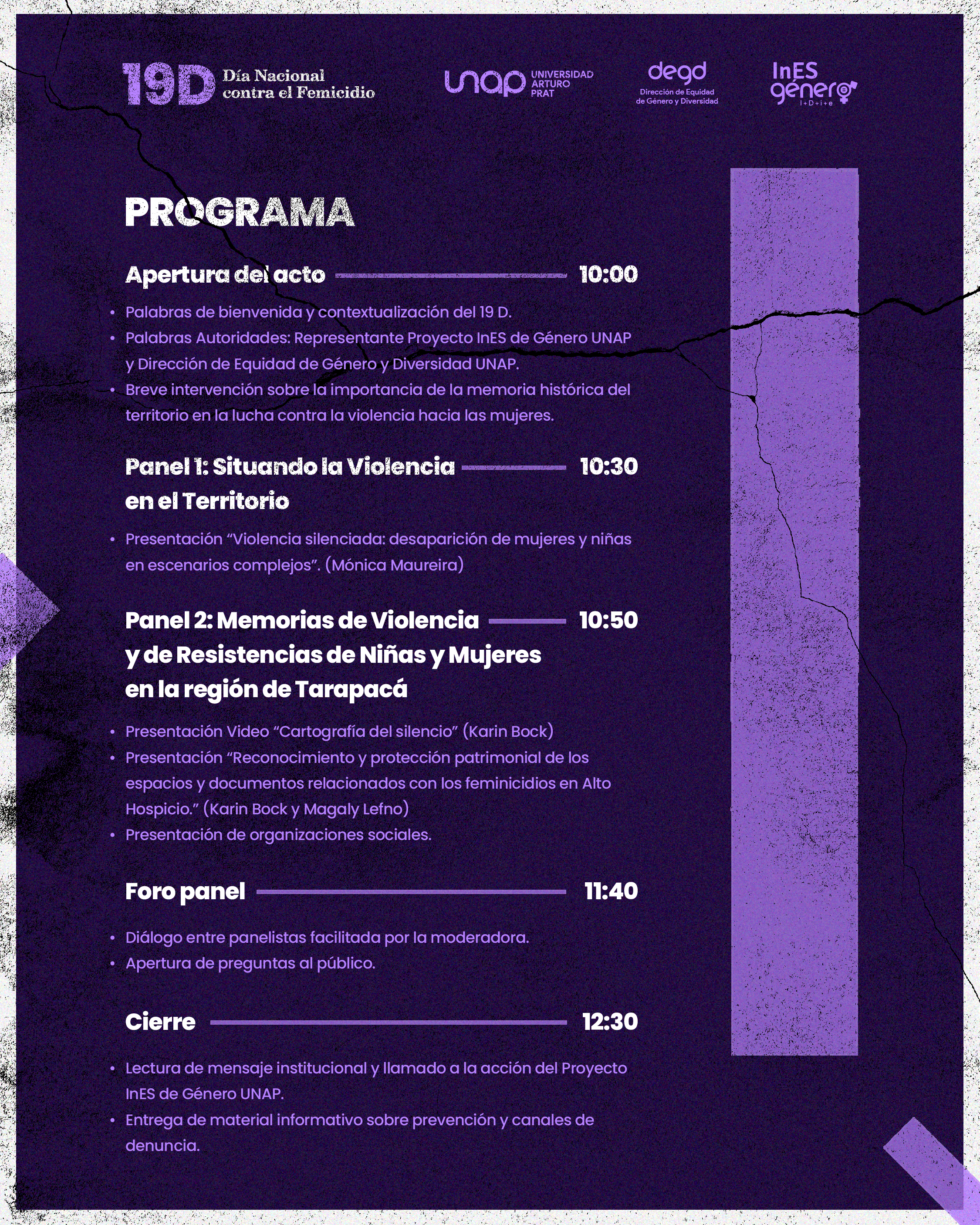 La jornada de reflexión contará con el Panel I: Situando la Violencia en el Territorio, que será presentado por Mónica Maureira Martínez, quien actualmente se desempeña como docente en la Escuela de Periodismo de la Universidad Diego Portales y como encargada de comunicaciones de la dirección de Género, Diversidad y Equidad de la Universidad de Santiago de Chile, con la ponencia “Violencia silenciada: desaparición de mujeres y niñas en escenarios complejos”. Este espacio permitirá contextualizar las múltiples formas en que la violencia se manifiesta y se invisibiliza en distintos territorios. El panel II: Memorias de Violencia y de Resistencias de Niñas y Mujeres en la región de Tarapacá profundizará en experiencias locales a través del video “Cartografía del silencio” de Karin Bock Gálvez, quien actualmente cursa el doctorado en Estudios Americanos en la Universidad de Santiago de Chile, seguida de la presentación “Reconocimiento y protección patrimonial de los espacios y documentos relacionados con los feminicidios en Alto Hospicio”, realizada por Karin Bock Gálvez y Magaly Lefno Estrada, reconocida activista y madre de una de las víctimas.