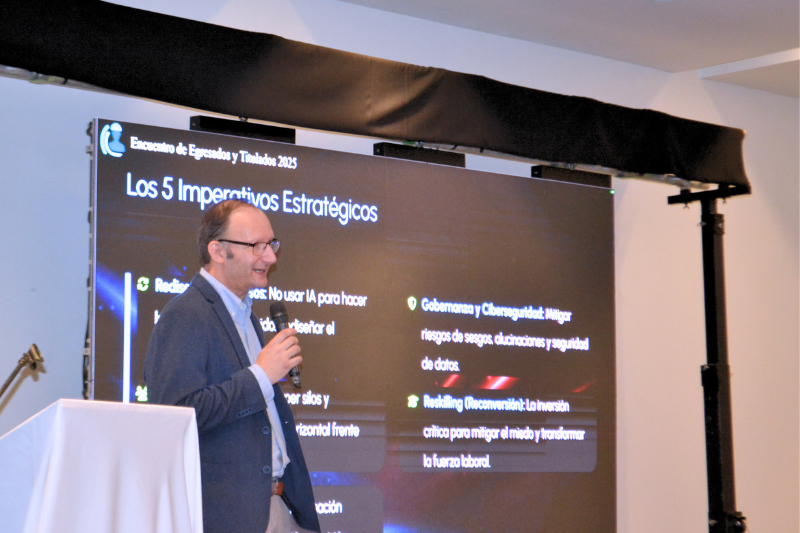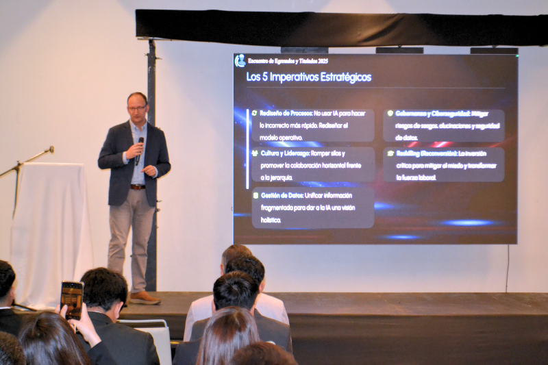 •La actividad reunió a estudiantes, titulados y profesionales en torno a la automatización con IA, el liderazgo organizacional y los desafíos del sector productivo regional, fortaleciendo la misión formativa de la casa de estudios.
