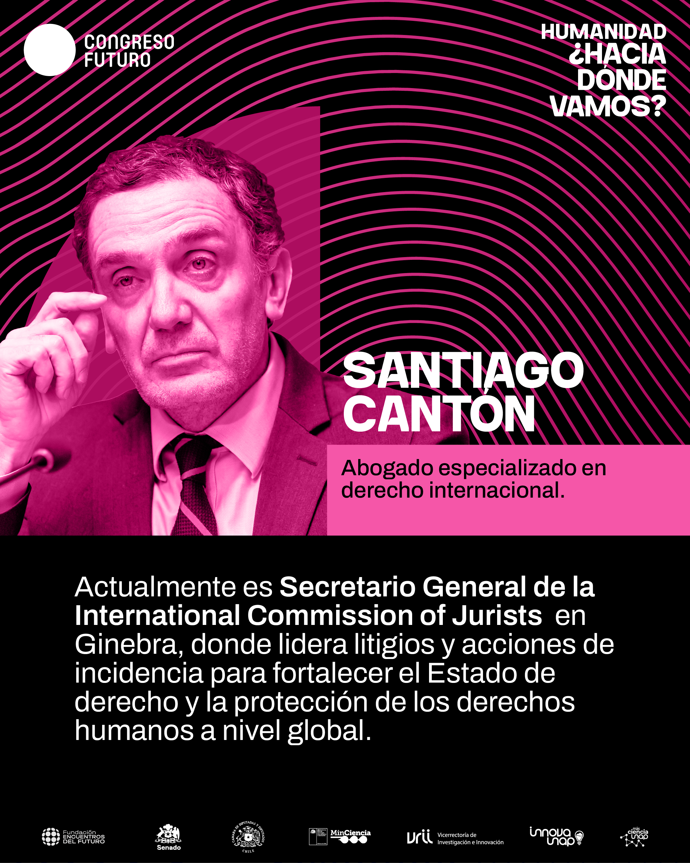 Asimismo, participará Santiago Cantón (Estados Unidos), abogado especializado en derecho internacional y actual Secretario General de la International Commission of Jurists. Su charla se centrará en los desafíos regionales para fortalecer el Estado de derecho, los derechos humanos y la construcción de relaciones basadas en la paz y el respeto democrático.