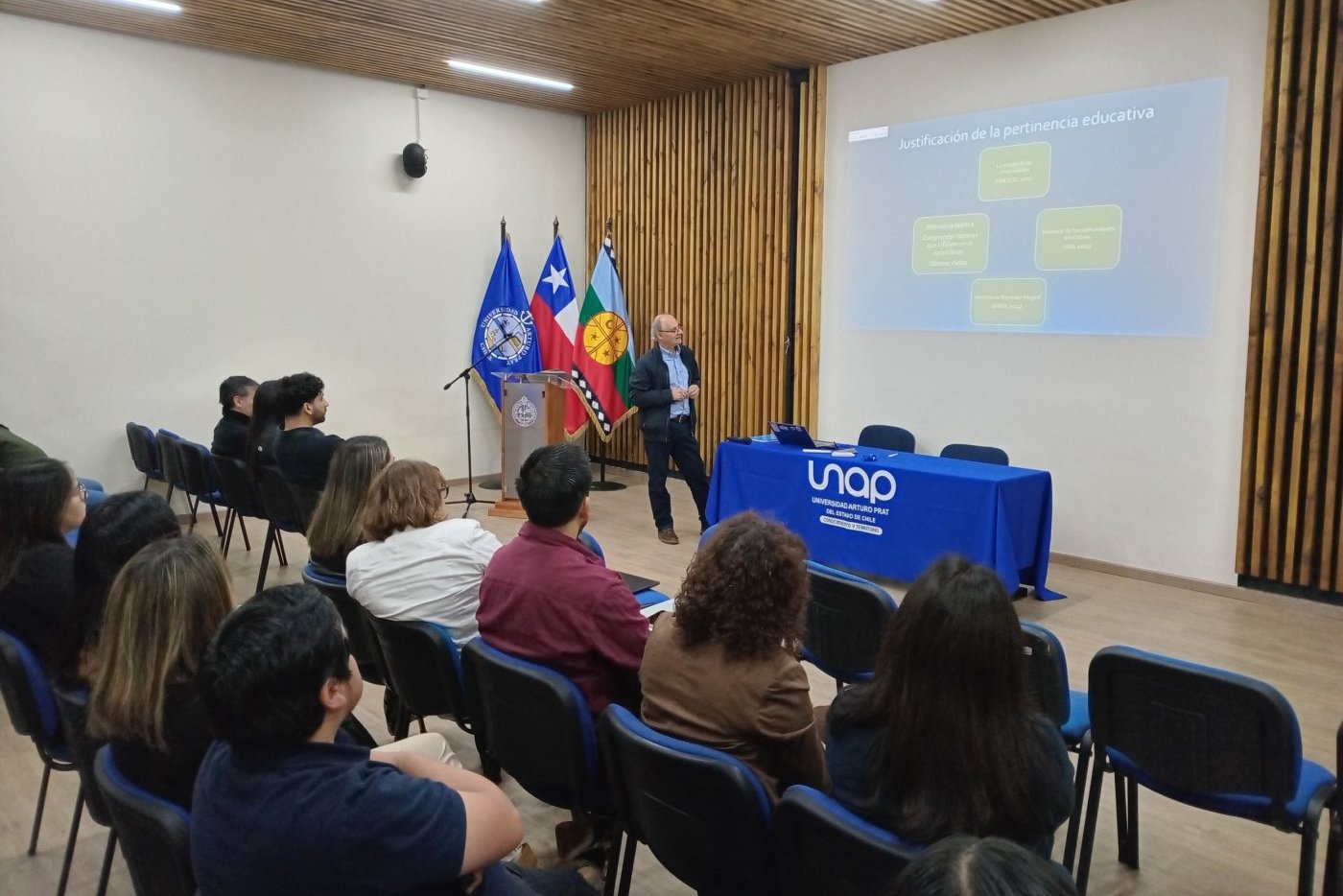 Efectuada en el Salón Auditorio, la instancia contempló diversas ponencias, iniciando con el Docente de Psicología, Dr. Nelson Castro Méndez, quien abordó la “Incidencia de las prácticas docentes en el bienestar/malestar subjetivo del estudiante universitario en carreras de la salud”; seguido por los representantes de la Unidad de Apoyo al Aprendizaje Estudiantil (UNIA), Ana Sandoval Durán y César Pérez Hidalgo, quienes hablaron sobre el “Diseño y aplicación piloto orientado a potenciar la preparatividad académica universitaria a través de la tutoría par”; además del Jefe de Kinesiología y principal organizador, Carlos Sepúlveda Mancilla, con las “Competencias y efectividad de la docencia clínica en profesionales de la rehabilitación. Proyecto UNAP Inicia 2024-2025”.