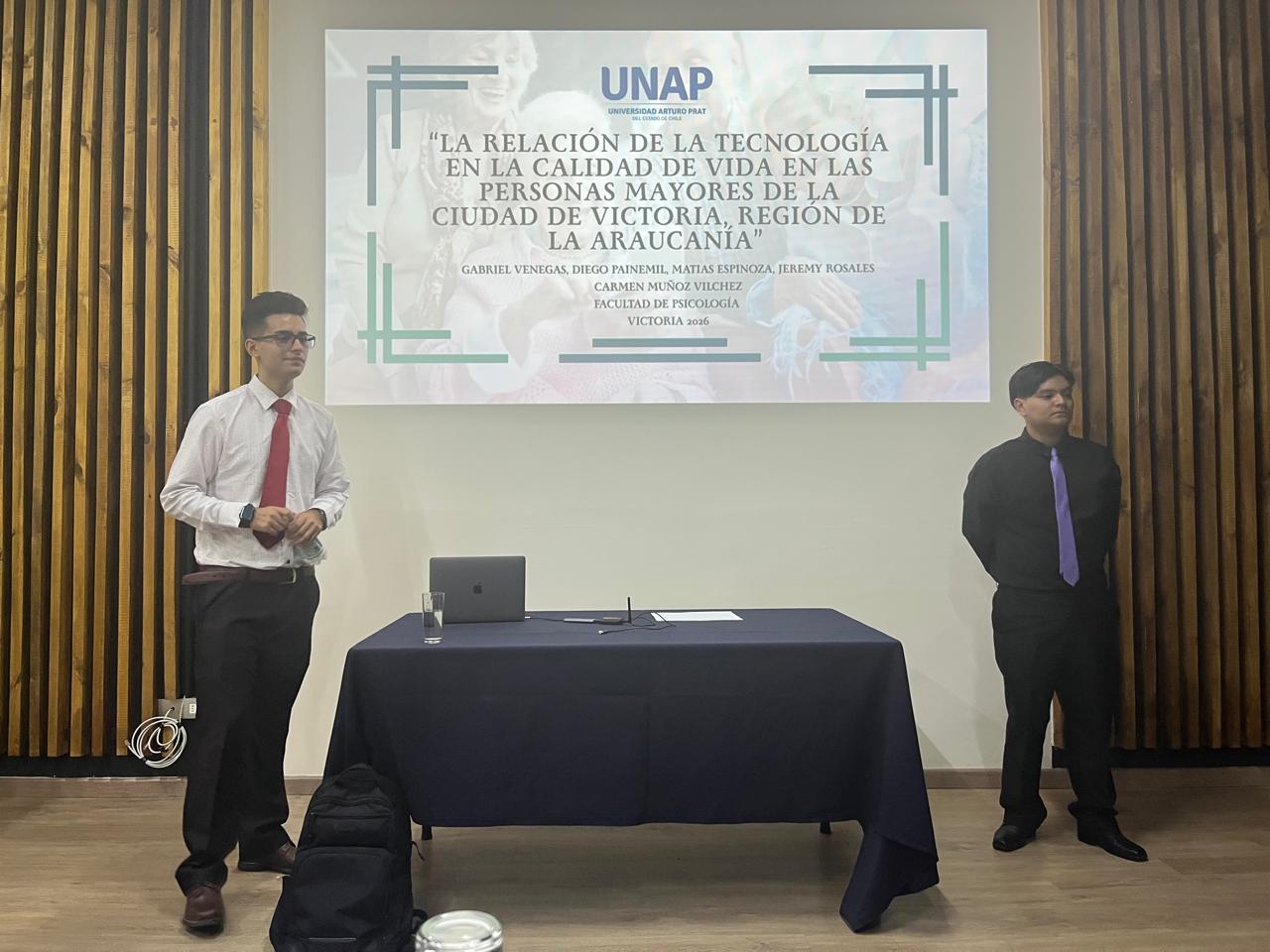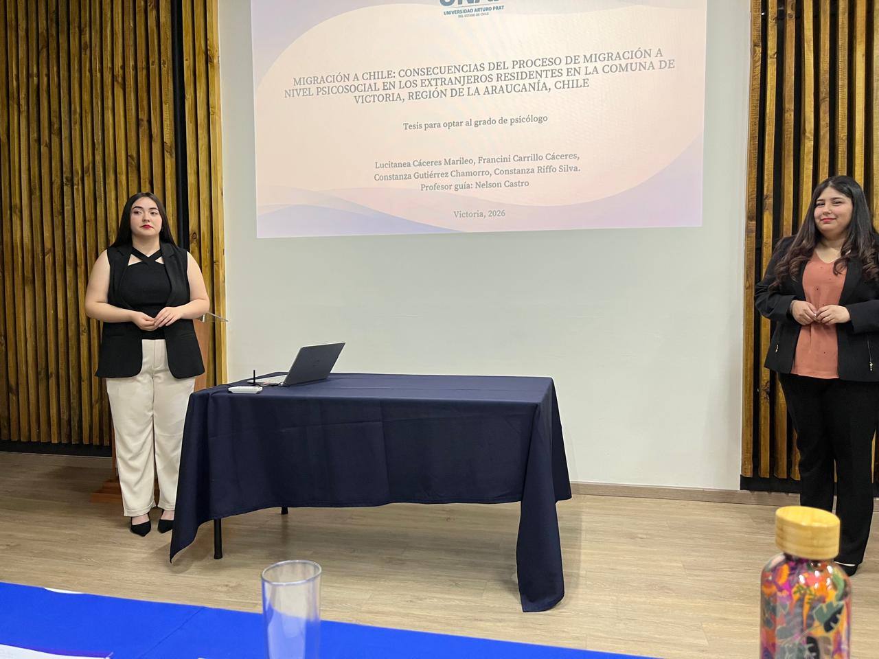 En la oportunidad, aprovechamos de conversar con algunas unapinas y unapinos de Psicología, quienes recientemente finalizaron con éxito sus defensas de tesis frente a la comisión evaluadora de académicos, abarcando temáticas como las “Funciones ejecutivas y participación social en adultos mayores en la ciudad de Victoria, región de La Araucanía durante el año 2025”, “Migración a Chile: consecuencias del proceso de migración a nivel psicosocial en los extranjeros residentes en la comuna de Victoria, región de La Araucanía”, y “El diseño del aula y su influencia en el proceso de aprendizaje de los estudiantes de la escuela Ignacio Carrera de la comuna de Victoria”, por mencionar algunas.