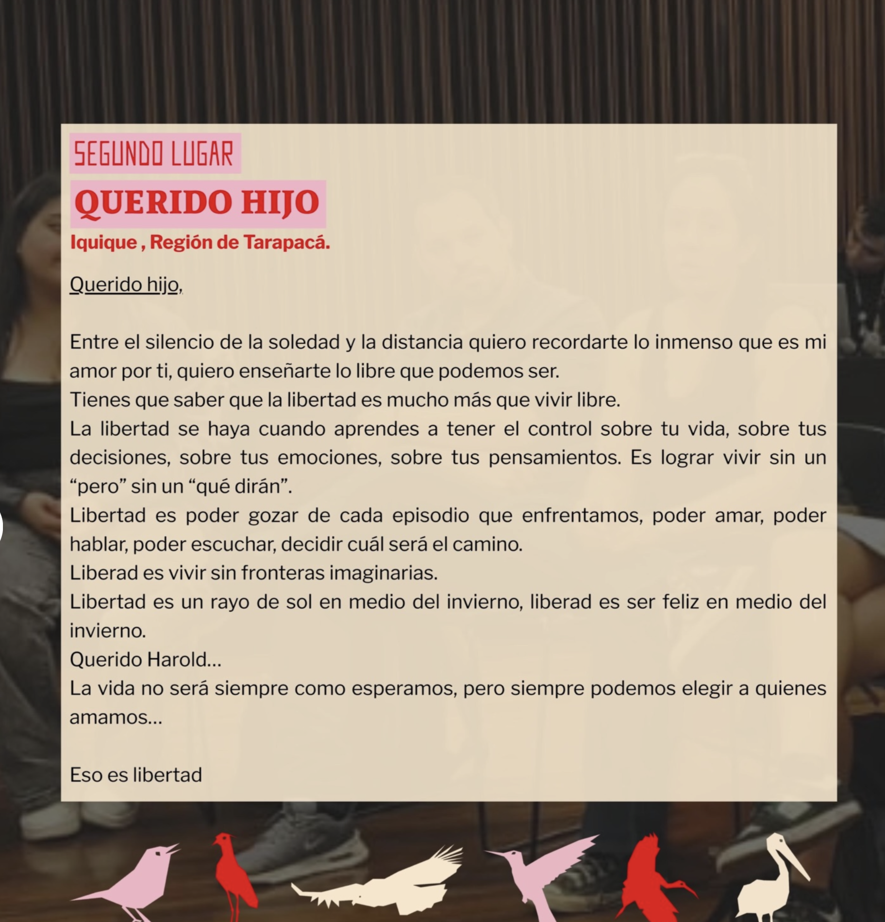 Este concurso literario, ejecutado por Pájarx entre Púas, organización transfeminista dedicada al trabajo en cárceles de mujeres y diversidades, junto al Sistema Nacional de Bibliotecas Públicas (SNBP), en coordinación con Gendarmería de Chile y entidades aliadas ejecutoras (universidades, fundaciones y organizaciones sociales), invitó a personas privadas de libertad de todo Chile a reflexionar y escribir sobre la pregunta ¿Qué es la libertad para ti?. Además, la convocatoria reunió a más de 500 participantes y contó con un destacado jurado: Mon Laferte (artista y compositora), Daniela Catrileo (artista, escritora y poeta mapuche) y Marcial Maldonado (artista, escritor y exprivado de libertad).