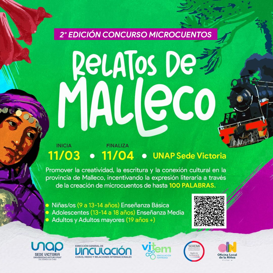 Buscando superar la convocatoria de su primera versión, la segunda edición del concurso de microcuentos “Relatos de Malleco” vuelve de la mano de la Unidad de Vinculación con el Medio y el Programa de Vinculación Temprana (VITEM) de la Universidad Arturo Prat Sede Victoria, en conjunto con la Seremi de las Culturas, las Artes y el Patrimonio; más la Oficina Local de la Niñez (OLN) de la Municipalidad de la comuna.