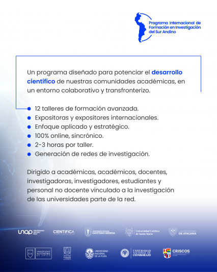 Este programa representa un paso significativo en la consolidación de una comunidad científica latinoamericana, y especialmente del Sur Andino, más integrada, colaborativa y abierta al intercambio de saberes. Hemos logrado articular a nueve universidades de distintos países, junto a la red CRISCOS, para desarrollar un itinerario de doce talleres de formación en investigación impartidos por especialistas internacionales. Se trata de una iniciativa que no solo fortalece las capacidades investigativas de nuestras comunidades académicas, sino que también impulsa la cooperación interuniversitaria, la circulación del conocimiento y la construcción de redes científicas transfronterizas con vocación de impacto regional".
