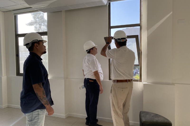 Los trabajos se concentran principalmente en el primer piso del edificio, específicamente en oficinas, el hall central y los baños, donde se desarrollan labores de pintura, instalación de puertas y colocación de vidrios. Asimismo, se realizan intervenciones en la escalera ubicada frente a Rectoría y en el frontis del edificio. En el auditorio, en tanto, continúan los trabajos de instalaciones eléctricas, cielos y habilitación del sistema salvaescala.