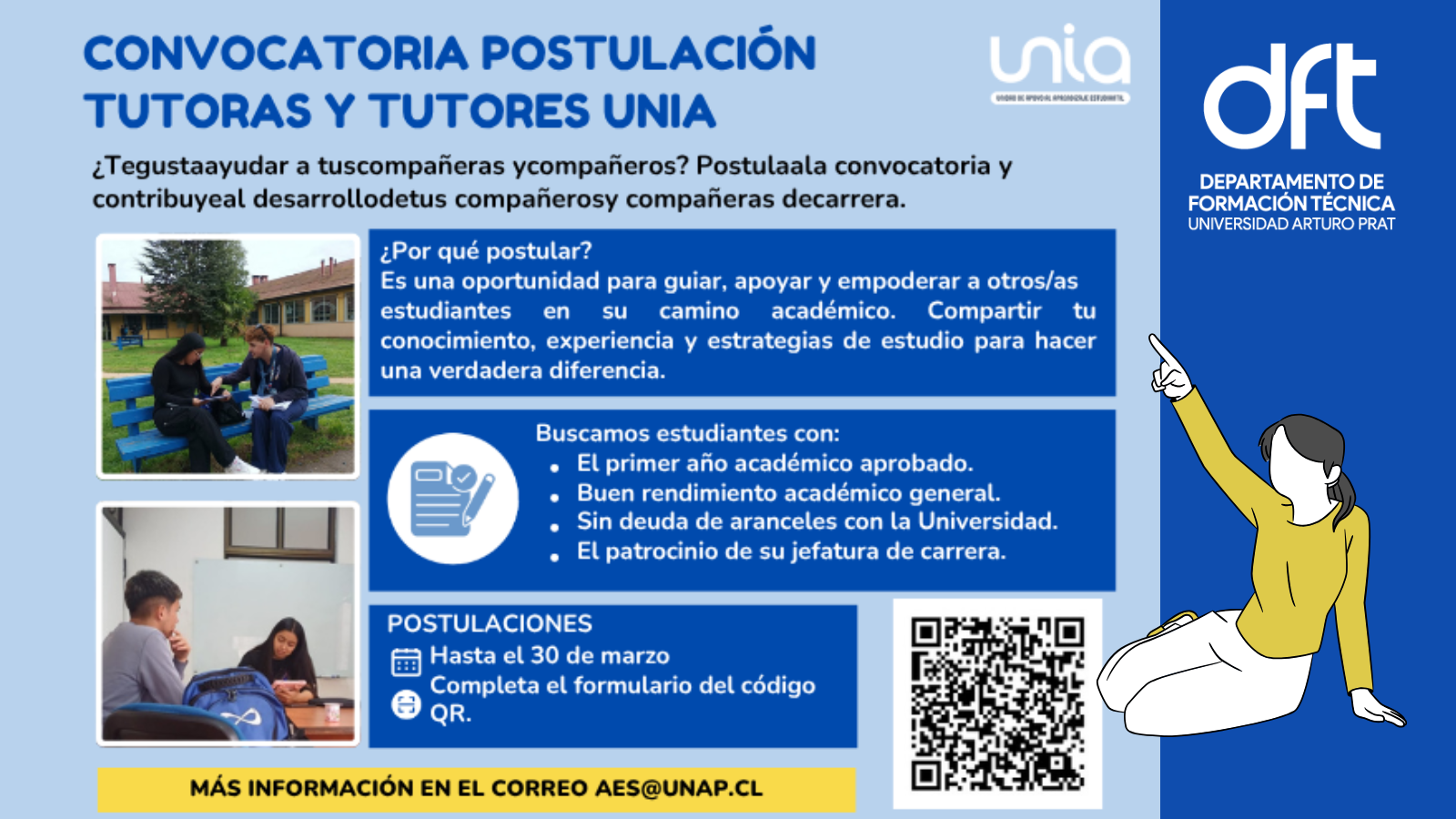 El Departamento de Formación Técnica invita a todas y todos los estudiantes a postular a la nueva Convocatoria de Tutoras y Tutores UNIA, una instancia pensada para quienes disfrutan ayudando, acompañando y guiando a sus compañeras y compañeros en su proceso académico.