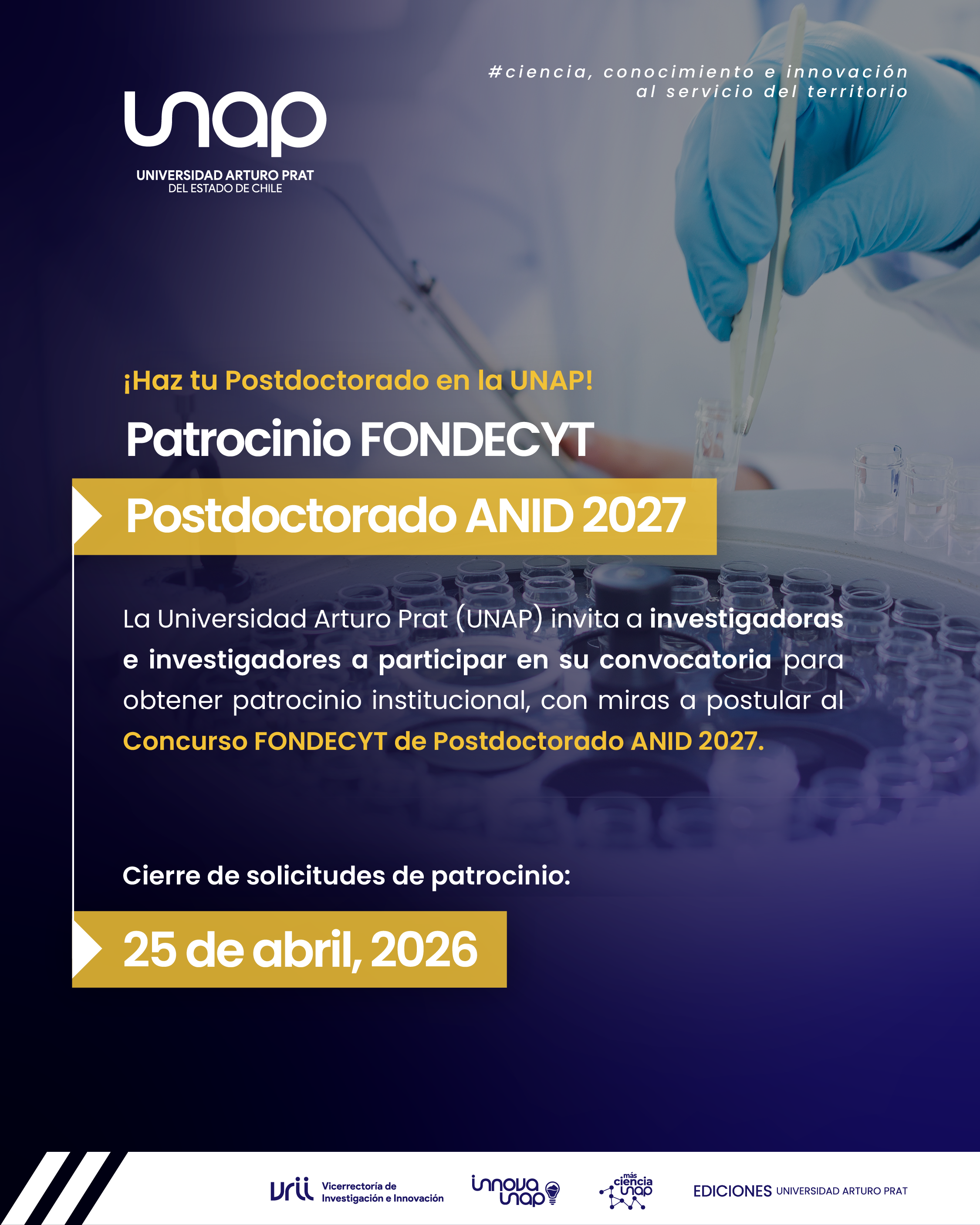 La Universidad Arturo Prat (UNAP), a través de su Vicerrectoría de Investigación e Innovación (VRII), abre la presente convocatoria para patrocinar a investigadoras e investigadores interesados en postular al concurso Fondo Nacional de Desarrollo Científico y Tecnológico (FONDECYT) de Postdoctorado 2027 de la Agencia Nacional de Investigación y Desarrollo (ANID).