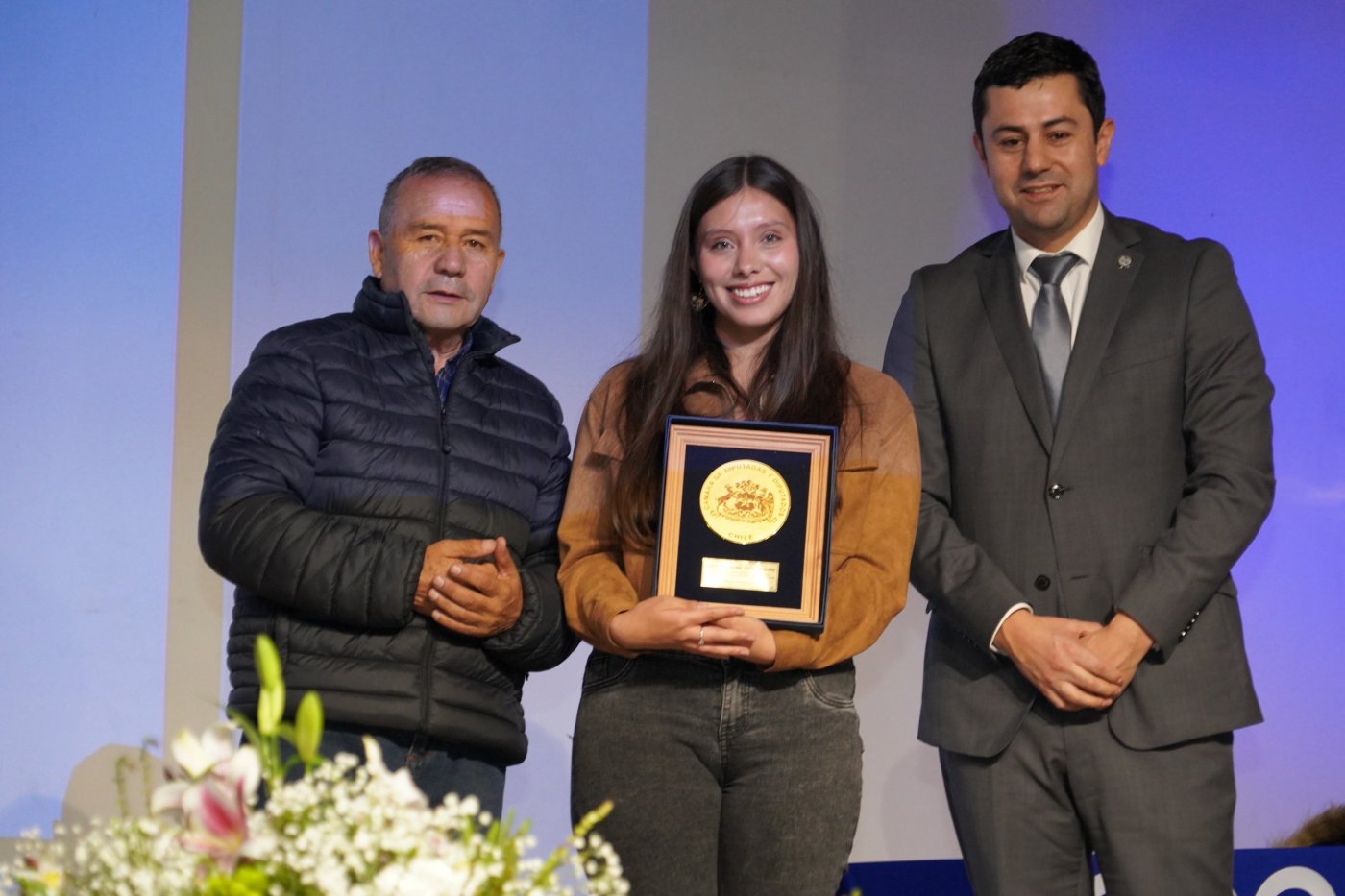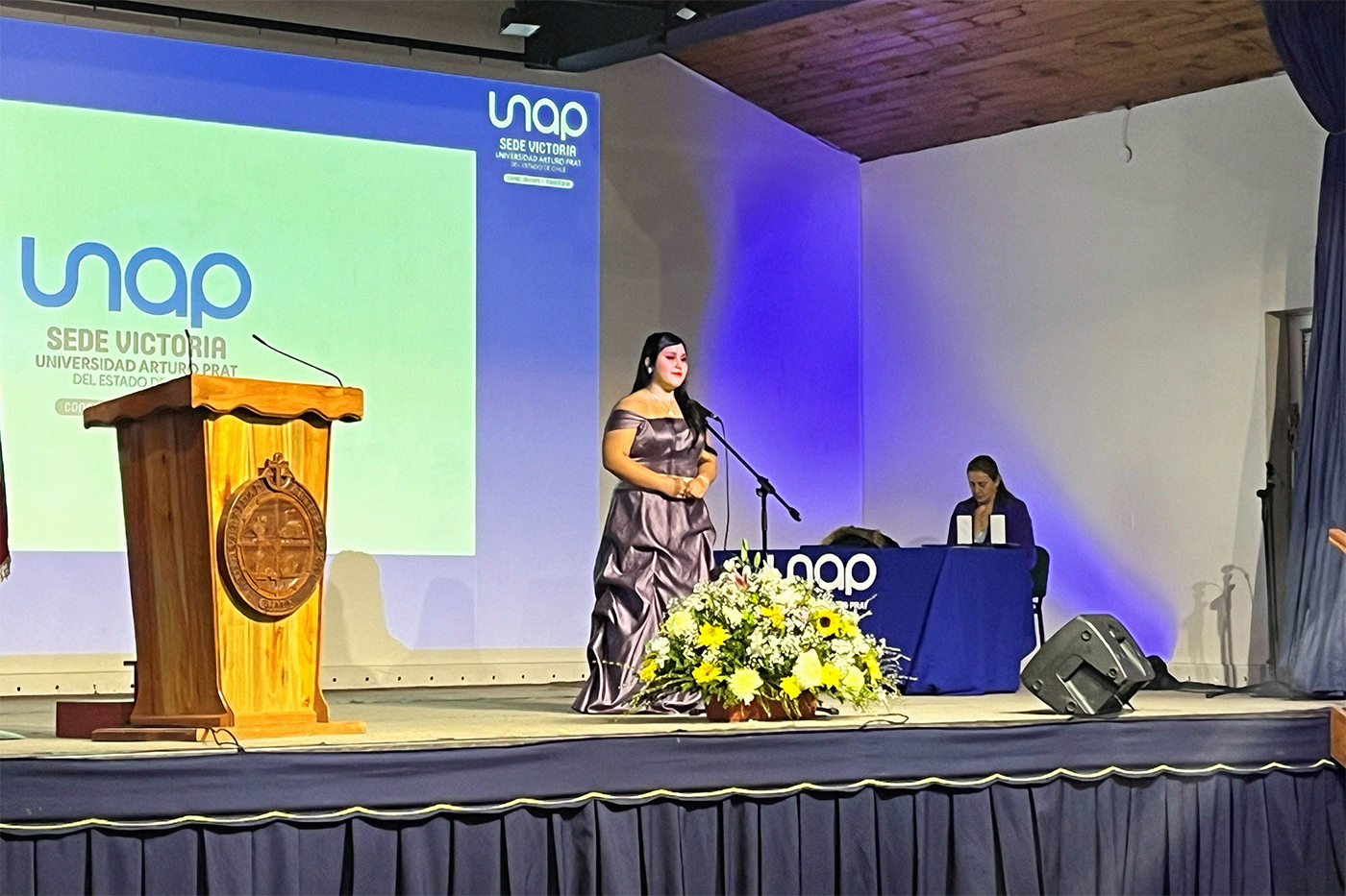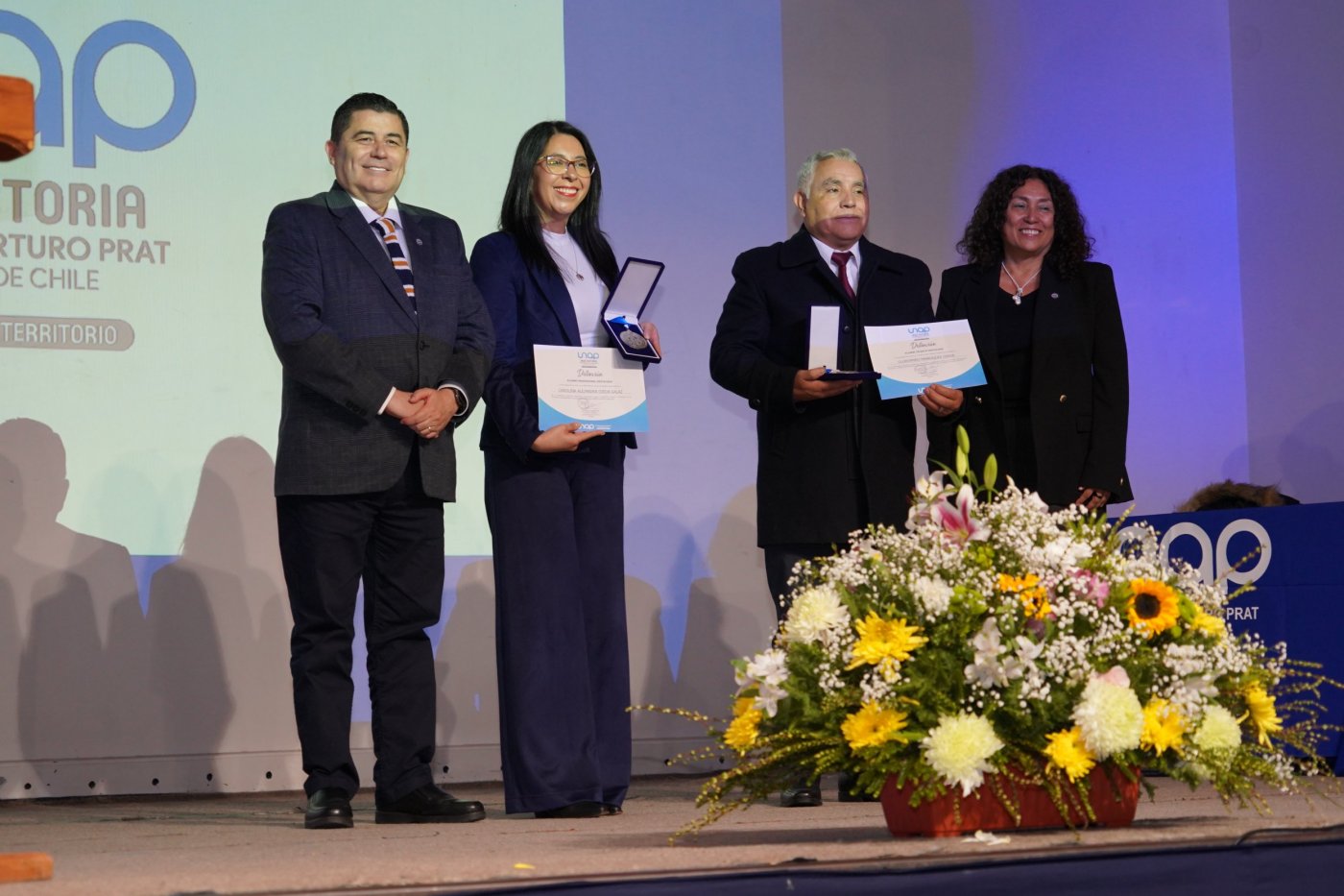 El evento también tuvo un espacio dedicado a destacar al aporte, la labor y trayectoria de personas ligadas a la Casa de Estudios Superiores, honor que recayó en los exestudiantes Carolina Ojeda Galaz, actual Directora regional de la Dirección del Trabajo y titulada de la carrera de Trabajo Social; y Clodomiro Manríquez Cerda, de la especialidad Técnico Universitario en Administración Financiera Contable, y quien se desempeñó durante cinco décadas en la Municipalidad de Victoria tras haberse jubilado este año. Finalmente, la distinción al “estudiante destacado”, instaurada desde el año pasado por iniciativa del Diputado Juan Carlos Beltrán Silva, fue otorgada a la estudiante de quinto año de Derecho, Alanis Sanhueza Muñoz, por su excelente rendimiento, participación y aporte a la carrera de la Facultad de Ciencias Jurídicas y Políticas, llegando así al final de la ceremonia con toda la concurrencia de pie para entonar el himno de la UNAP.