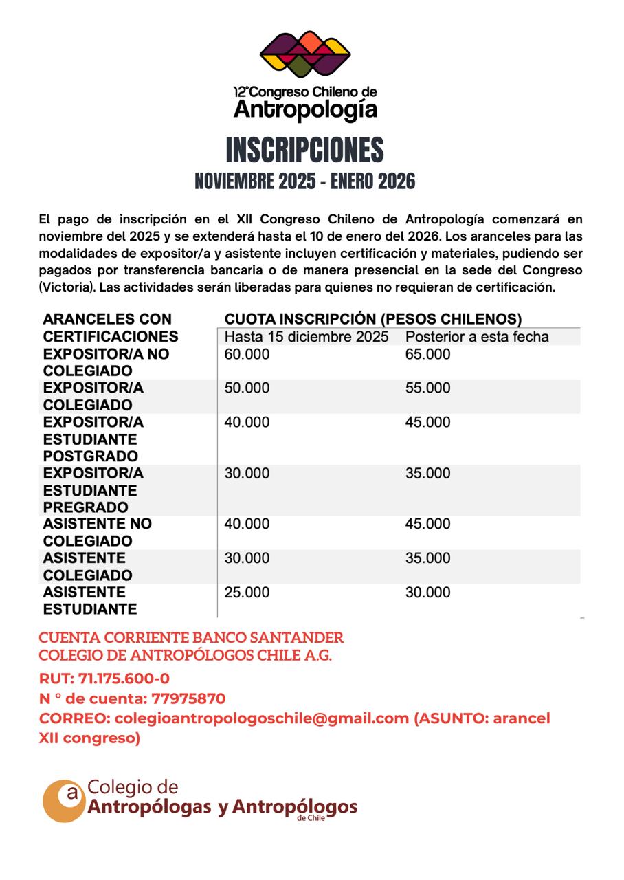 Para mayor información sobre el proceso de inscripción comunicarse al siguiente correo: colegioantropologoschile@gmail.com