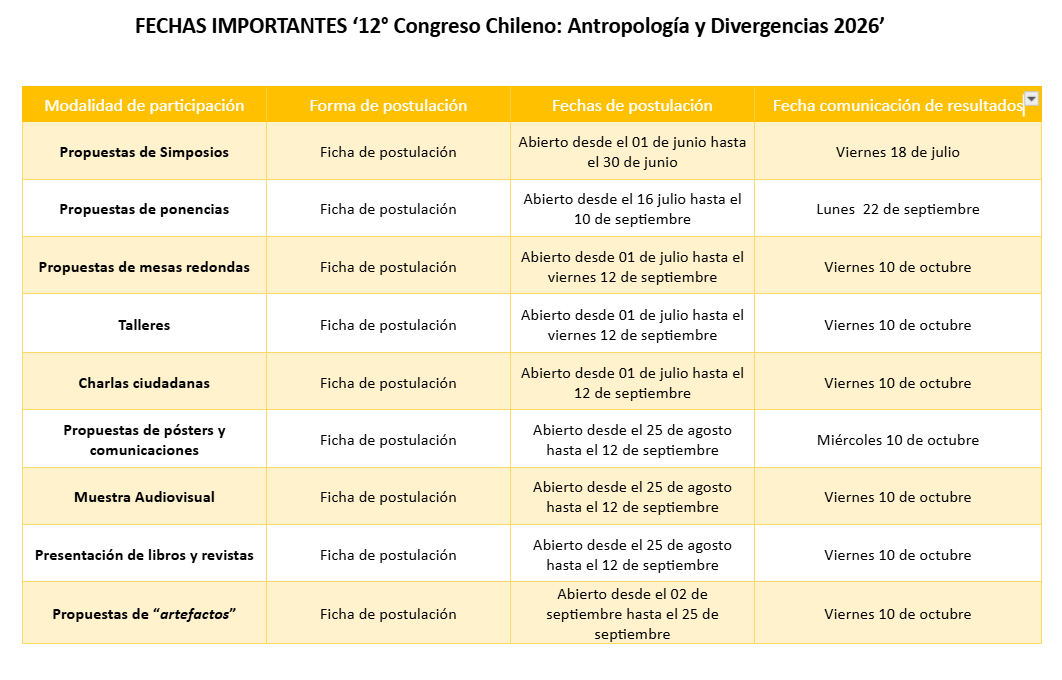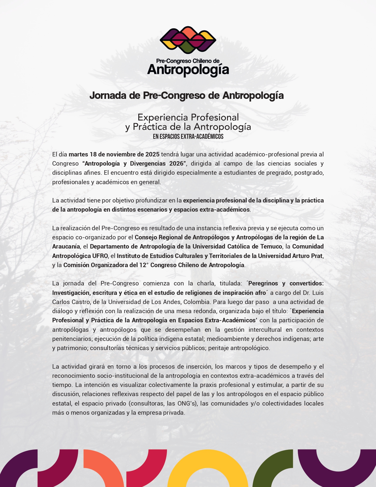 “Antropologías y Divergencias 2026 representa un espacio de reflexión que nos permite pensar en las diferencias culturales que dinamizan las relaciones humanas y generan nuevas formas de intercambios, prácticas e identidades en contextos de electricidad y simultaneidad. Los temas que se revisarán durante las actividades del 12° Congreso Chileno de Antropología agrupan voces noveles en la antropología que dan cuenta de nuevos escenarios y problemáticas, como son, precisamente, áreas de estudio relacionadas con la conservación ambiental, extractivismos, resistencias, ruralidades, crisis hídricas y conflictos socio-ambientales, performance, cuerpo y danza, envejecimiento, soledad y nostalgia, re-emergencias indígenas y afrodescendientes, espiritualidades y religiones, patrimonio y territorio, educación e interculturalidad, salud intercultural, migraciones y movilidades, desafíos ético-metodológicos en la práctica antropológica, metodologías situadas, etnografías del Estado, etnografías poéticas, subjetividades, memorias, identidades y derechos humanos. En el campo de las ciencias sociales y, la antropología en específico, este evento representa uno de los espacios de diálogo y reflexión con mayor relevancia en los últimos años en Chile”.